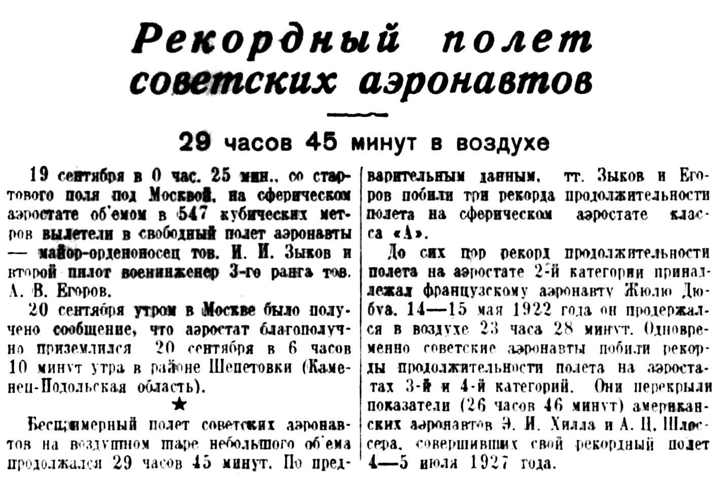 Беспримерный полет советских аэронавтов на воздушном шаре небольшого объема продолжался 29 часов 45 минут. По предварительным данным, тт. Зыков и Егоров побили три рекорда продолжительности полета на сферическое аэростате класса «А».