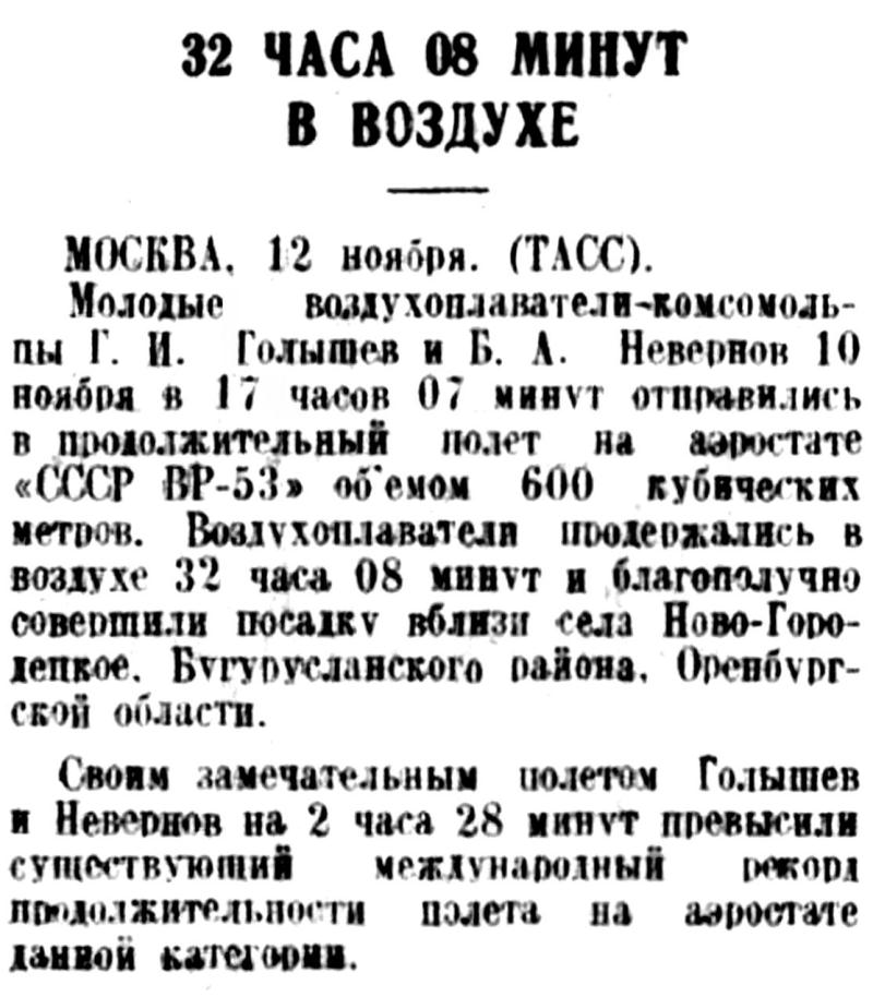 Молодые воздухоплаватели-комсомольцы Г. И. Голышев и Г. А. Невернов 10 ноября в 17 часов 07 минут отправились в продолжительный полет на аэростате «СССР ВР-53» объемом 600 кубических метров. Воздухоплаватели продержались в воздухе 32 часа 08 минут и благополучно совершили посадку вблизи села Ново-Городецкое, Бугурусланского района, Оренбургской области.
