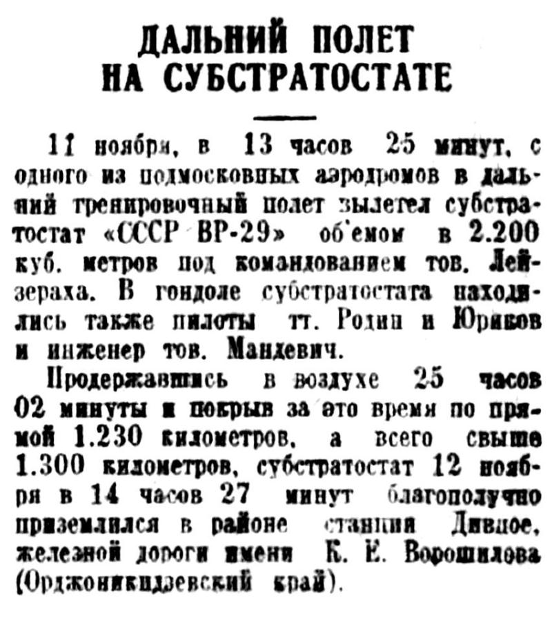 11 ноября, в 13 часов 25 минут, с одного из подмосковных аэродромов в дальний тренировочный полет вылетел субстратостат «СССР ВР-29» объемом в 2.200 куб. метров под командованием тов. Лейзераха. В гондоле субстратостата находились также пилоты тт. Родин и Юриков и инженер тов. Мандевич.
