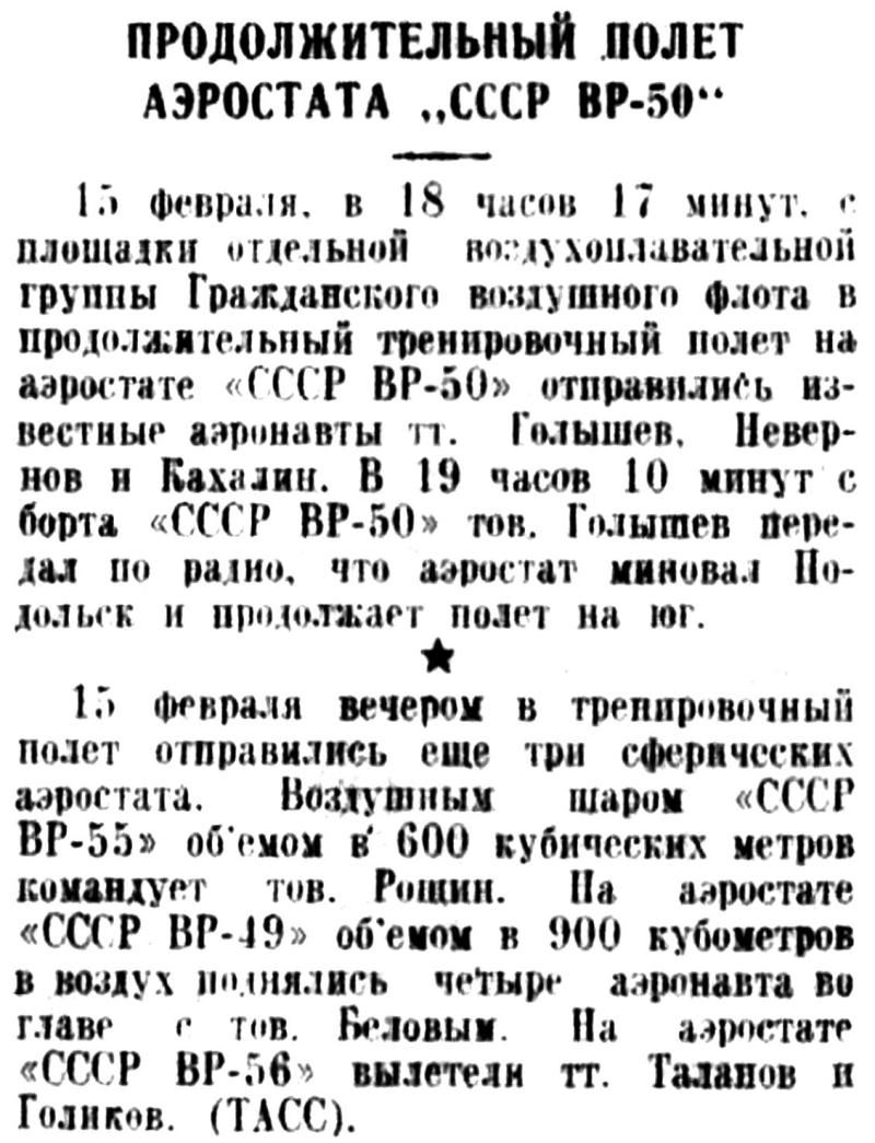 15 февраля, в 18 часов 17 минут, с площадки отдельной воздухоплавательной группы Гражданского воздушного флота и продолжительный тренировочный полет на аэростате «СССР ВР-50» отправились известные аэронавты т. Голышев, Невернов и Кахалин. В 19 часов 10 минут с борта «СССР ВР-50» тов. Голышев передал по радио, что аэростат миновал Подольск и продолжает полет на юг.