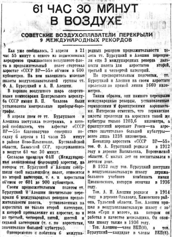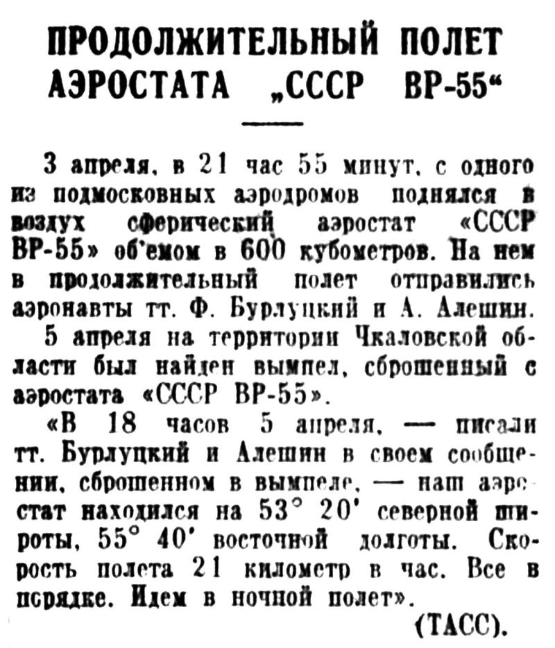 3 апреля, в 21 час 55 минут, с одного из подмосковных аэродромов поднялся в воздух сферический аэростат «СССР ВР-55» объемом в 600 кубометров. На нем в продолжительный полет отправились аэронавты тт. Ф. Бурлуцкий и А. Алешин.