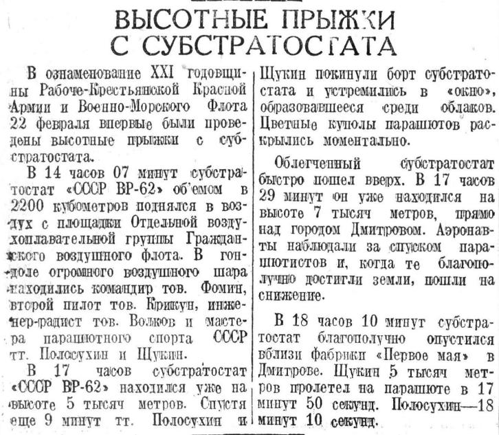 В ознаменование XXI годовщины Рабоче-Крестьянской Красной Армии и Военно-Морского Флота 22 февраля впервые были проведены высотные прыжки с субстратостата,
