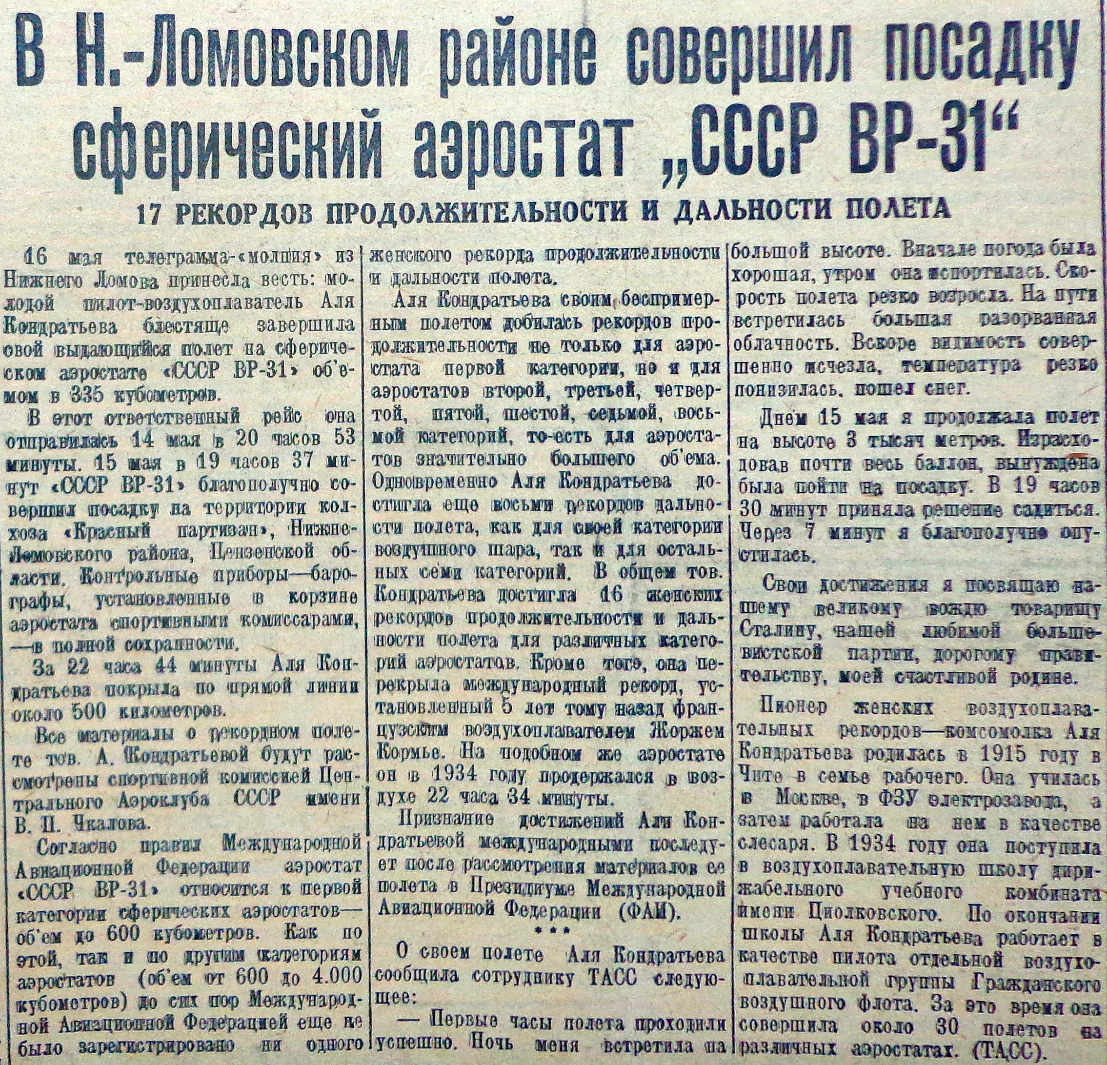 16 мая телеграмма-"молния" из Нижнего Ломова принесла весть: молодой пилот-воздухоплаватель Аля Кондратьева блестяще завершила свой выдающийся полет на сферическом аэростате "СССР ВР-31" объемом в 335 кубометров.