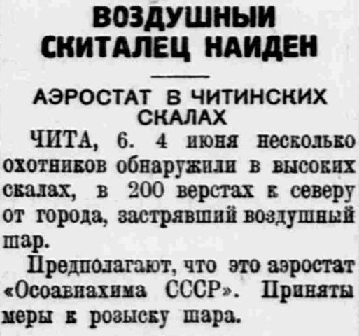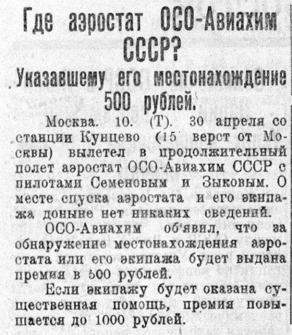 Москва. 10. (Т). 30 апреля со станции Кунцево (15 верст от Москвы) вылетел в продолжительный полет аэростат ОСО-Авиахим СССР с пилотами Семеновым и Зыковым. О месте спуска аэростата и его экипажа доныне нет никаких сведений.