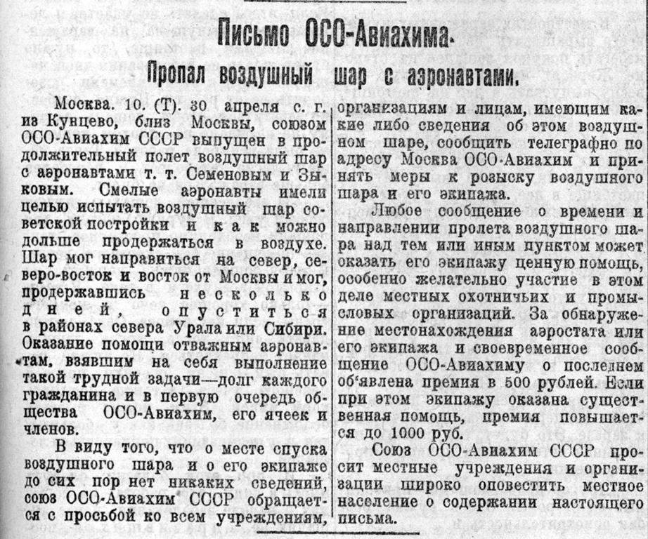 Москва. 10. (Т). 30 апреля с. г. из Кунцево, близ Москвы, союзом ОСО-Авиахим СССР выпущен в продолжительный полет воздушный шар с аэронавтами т. т. Семеновым и Зыковым. Смелые аэронавты имели целью испытать воздушный шар советской постройки и как можно дольше продержаться в воздухе. Шар мог направиться на север, северо-восток и восток от Москвы и мог, продержавшись несколько дней, опуститься в районах севера Урала или Сибири. Оказание помощи отважным аэронавтам, вpявшим на себя выполнение такой трудной задачи — долг каждого гражданина и в первую очередь общества ОСО-Авиахим, его ячеек и членов.
