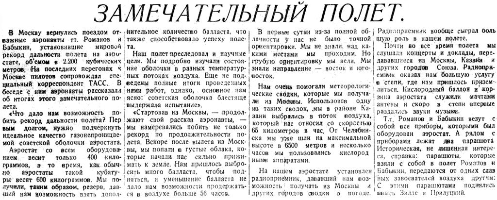 В Москву вернулись поездом отважные аэронавты тт. Романов и Бабыкин, установившие мировой рекорд дальности полета на аэростате, объемом в 2.200 кубических метров. На последних перегонах к Москве пилотов сопровождал специальный корреспондент ТАСС. В беседе с ним аэронавты рассказали об итогах этого замечательного полета.