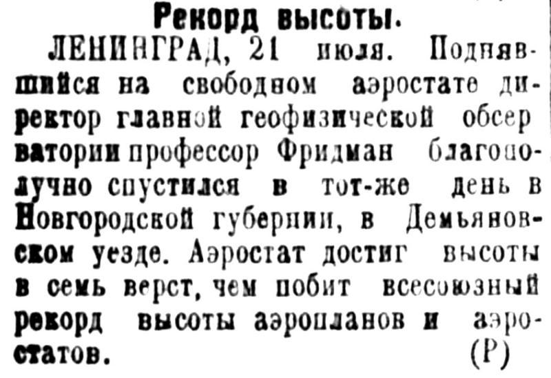 ЛЕНИНГРАД, 21 июля. Поднявшийся на свободном аэростате директор главной геофизической обсерватории профессор Фридман благополучно спустился в тот-же день в Новгородской губернии, в Демьяновском уезде. Аэростат достиг высоты в семь верст, чем побит всесоюзный рекорд высоты аэропланов и аэростатов. (Р)