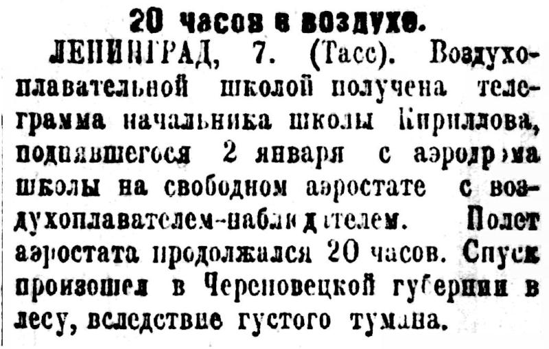 ЛЕНИНГРАД, 7. (Тасс). Воздухоплавательной школой получена телеграмма начальника школы Кириллова, поднявшегося 2 января с аэродрома школы на свободном аэростате с воздухоплавателем-наблюдателем. Полет аэростата продолжался 20 часов. Спуск произошел в Череповецкой губернии в лесу, вследствие густого тумана.