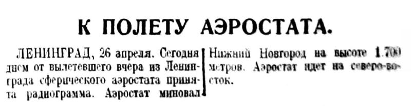 ЛЕНИНГРАД, 26 апреля. Сегодня днем от вылетевшего вчера из Ленинграда сферического аэростата принята радиограмма. Аэростат миновал Нижний Новгород на высоте 1.700 метров. Аэростат идет на северо-восток.