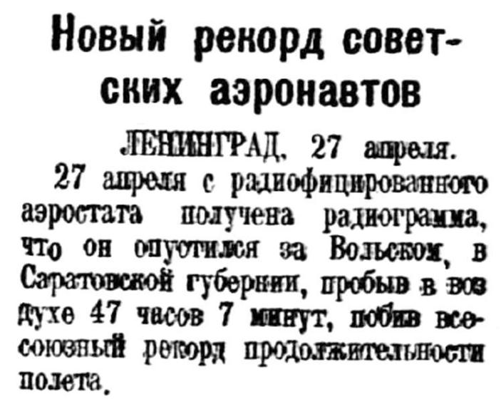 ЛЕНИНГРАД, 27 апреля. 27 апрели с радиофицированного аэростата получена радиограмма, что он опустился за Вольском, в Саратовской губернии, пробыв в воздухе 47 часов 7 минут, побив всесоюзный рекорд продолжительности полета.