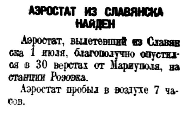 Аэростат, вылетевший из Славянска 1 июля, благополучно опустился в 30 верстах от Мариуполя, на станции Розовка. Аэростат пробыл в воздухе 7 часов.
