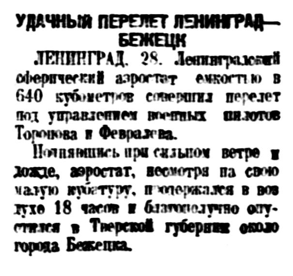 ЛЕНИНГРАД. 28. Ленинградский сферический аэростат емкостью 640 кубометров совершил перелет под управлением военных пилотов Торопова в Февралева.