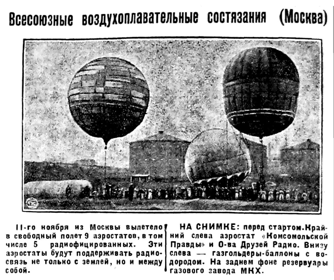11-го ноября из Москвы вылетело в свободный полет 9 аэростатов, в том числе 5 радиофицированных. Эти аэростаты будут поддерживать радиосвязь не только с землей, но и между собой.