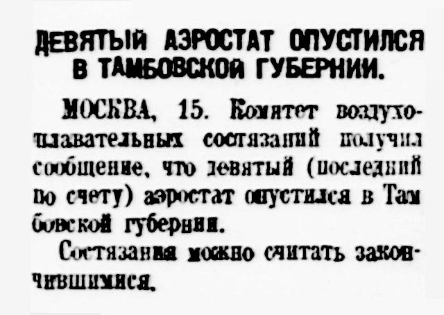 Получено сообщение о благополучном спуске аэростата московской воздухоплавательной школы на станции Кузьминки, в Тамбовской губернии.