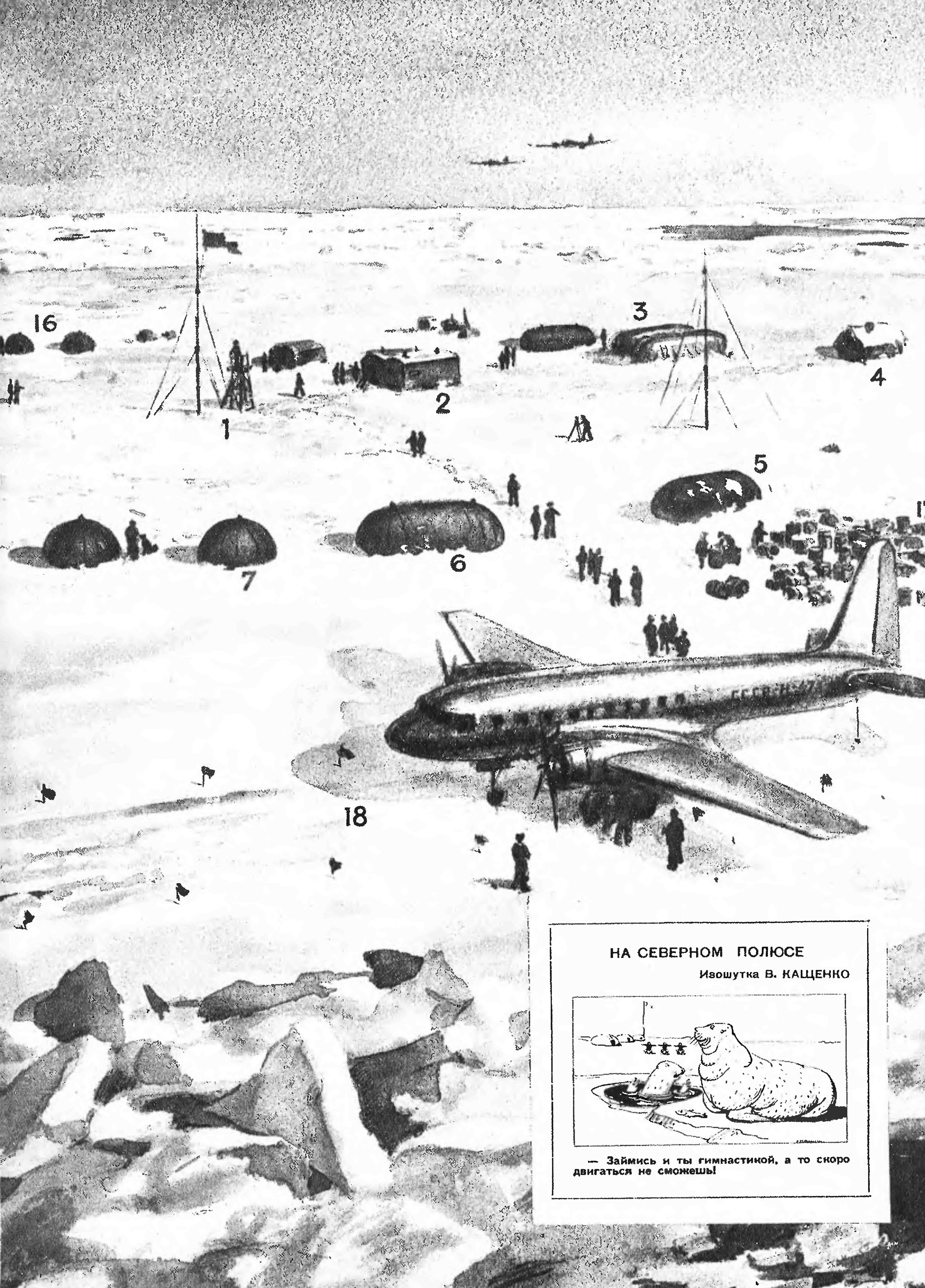 Через три дня мы погрузились в самолет П. П. Москаленко и, совершив многочасовое воздушное путешествие, спрыгнули на лед промежуточного аэродрома. Оттуда АН-2, превратившийся в воздушное такси, перебросил нас в лагерь, состоявший из единственной палатки, жители которой — кинооператор Евгений Яцун и журналист Савва Морозов — встретили нас приветственными кликами, шипящими бифштексами и горячим, как объятия, чаем. Воздушный мост Большая земля — Северный полюс заработал, как заведенный часовой механизм.