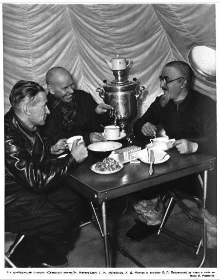 Вскоре гости и зимовщики собрались перед трибуной, сложенной из снежных блоков, под транспарантом «Да здравствует Первое мая!». Алексей Федорович зачитал приветственную радиограмму Председателя Президиума Верховного Совета К. Е. Ворошилова. Академик Д. И. Щербаков поздравил нас от имени президиума Академии наук СССР. С теплыми словами обратился к нам академик Е. К. Федоров — представитель легендарной папанинской четверки, открывшей счет советских дрейфующих станций. В общем все было как на Большой земле: речи, поздравления, аплодисменты и крики «ура».