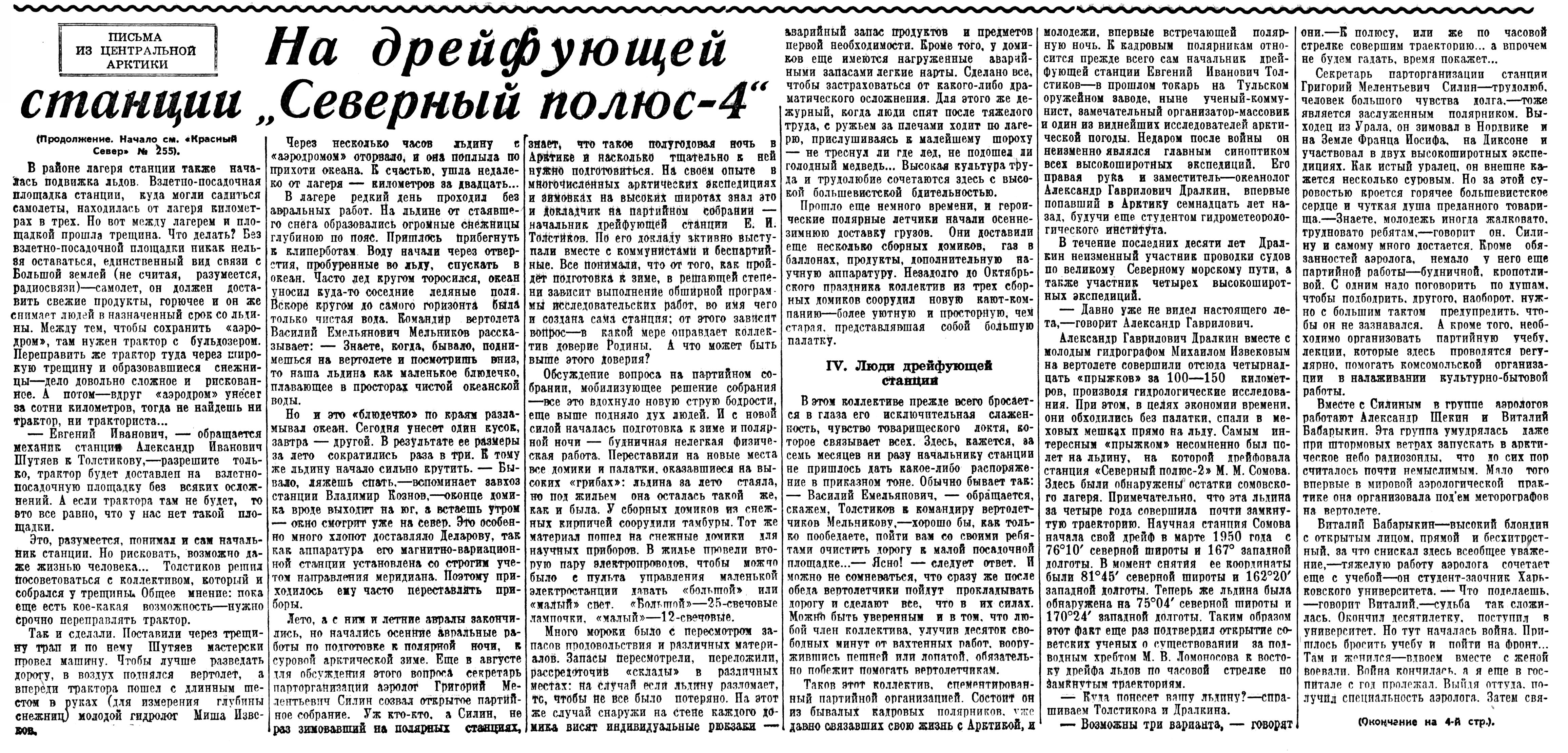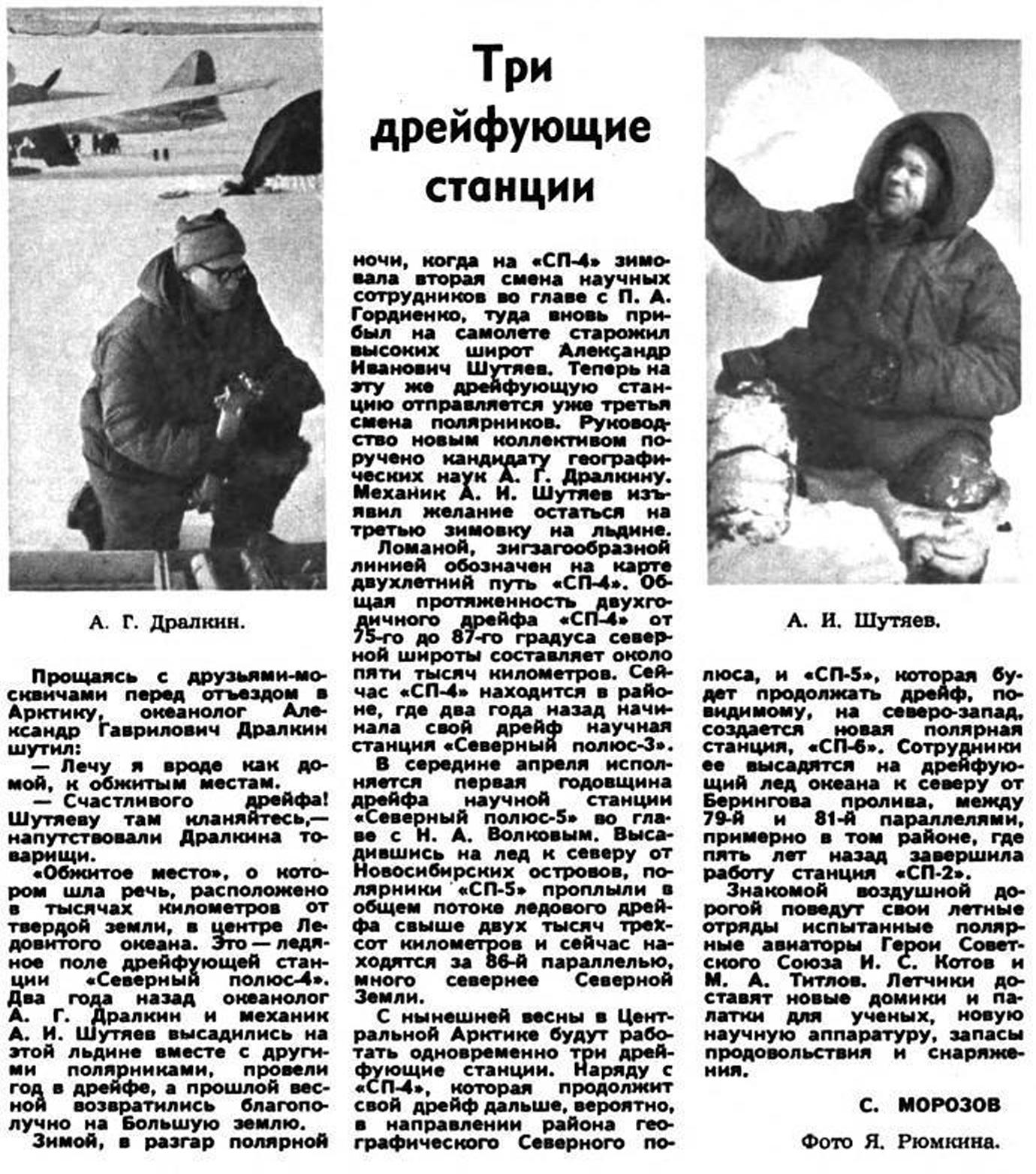 Знакомой воздушной дорогой поведут свои летные отряды испытанные полярные авиаторы Герои Советского Союза И. С. Котов и М. А. Титлов. Летчики доставят новые домики и палатки для ученых, новую научную аппаратуру, запасы продовольствия и снаряжения.