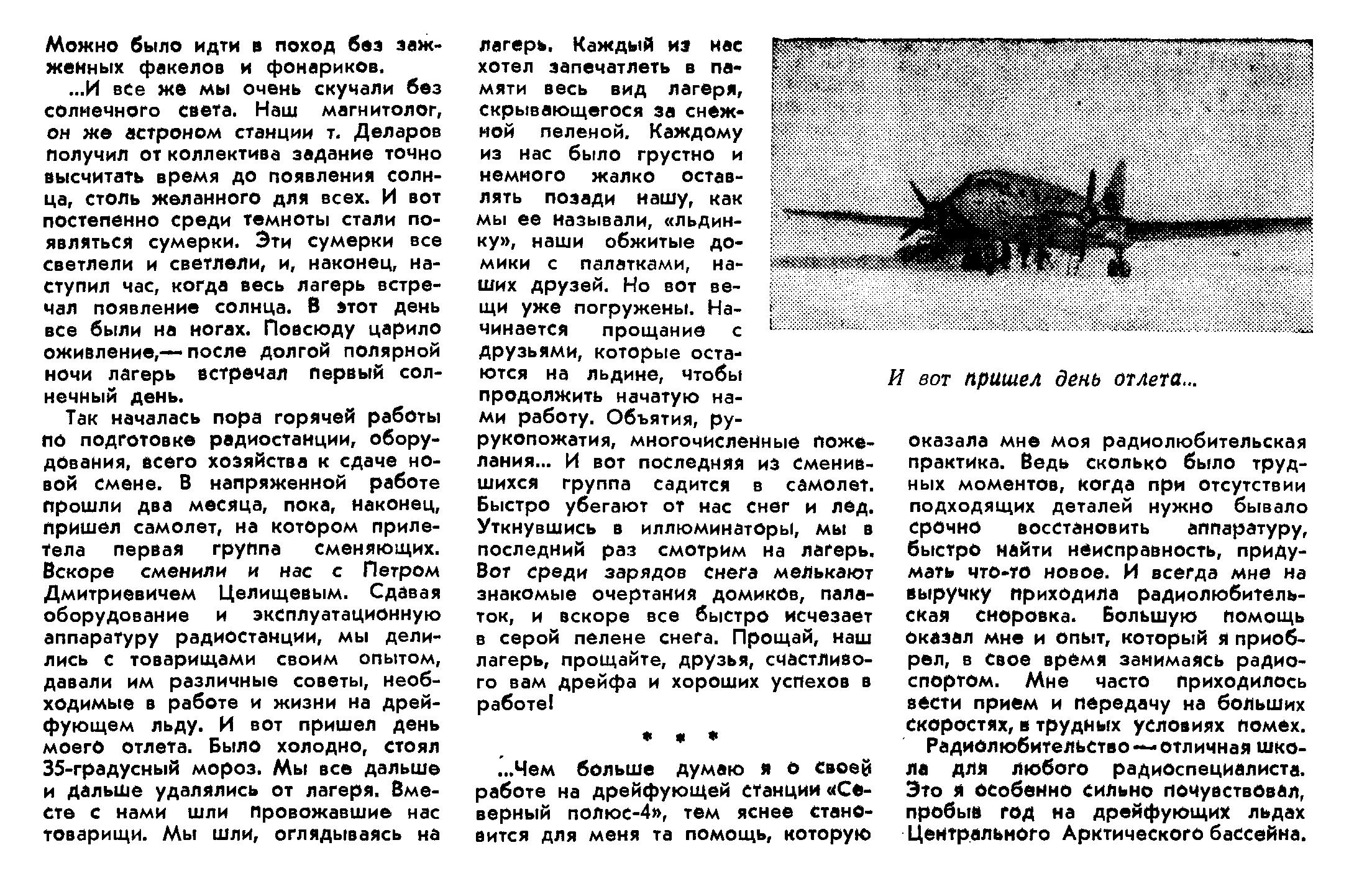 Противовес себя не оправдывает. Лучше работать с заземлением в «море». Мы сделали несколько выездов, испытывая не только аппаратуру, но и проверяя, как нас слушают на Большой земле. На земле за нами велось непрерывное наблюдение, поэтому связь проходила при любых условиях. Везти нарты по снегу с радиостанцией, с запасным имуществом и аварийным продовольствием для двух человек было тяжело, но тут помогала «тренировка»: в третий раз мы везли нарты гораздо лучше, чем в первый. Дружба и взаимопомощь в нашем коллективе помогли быстро ликвидировать все трудности, возникающие в работе и в жизни в такой необычной и сложной обстановке.