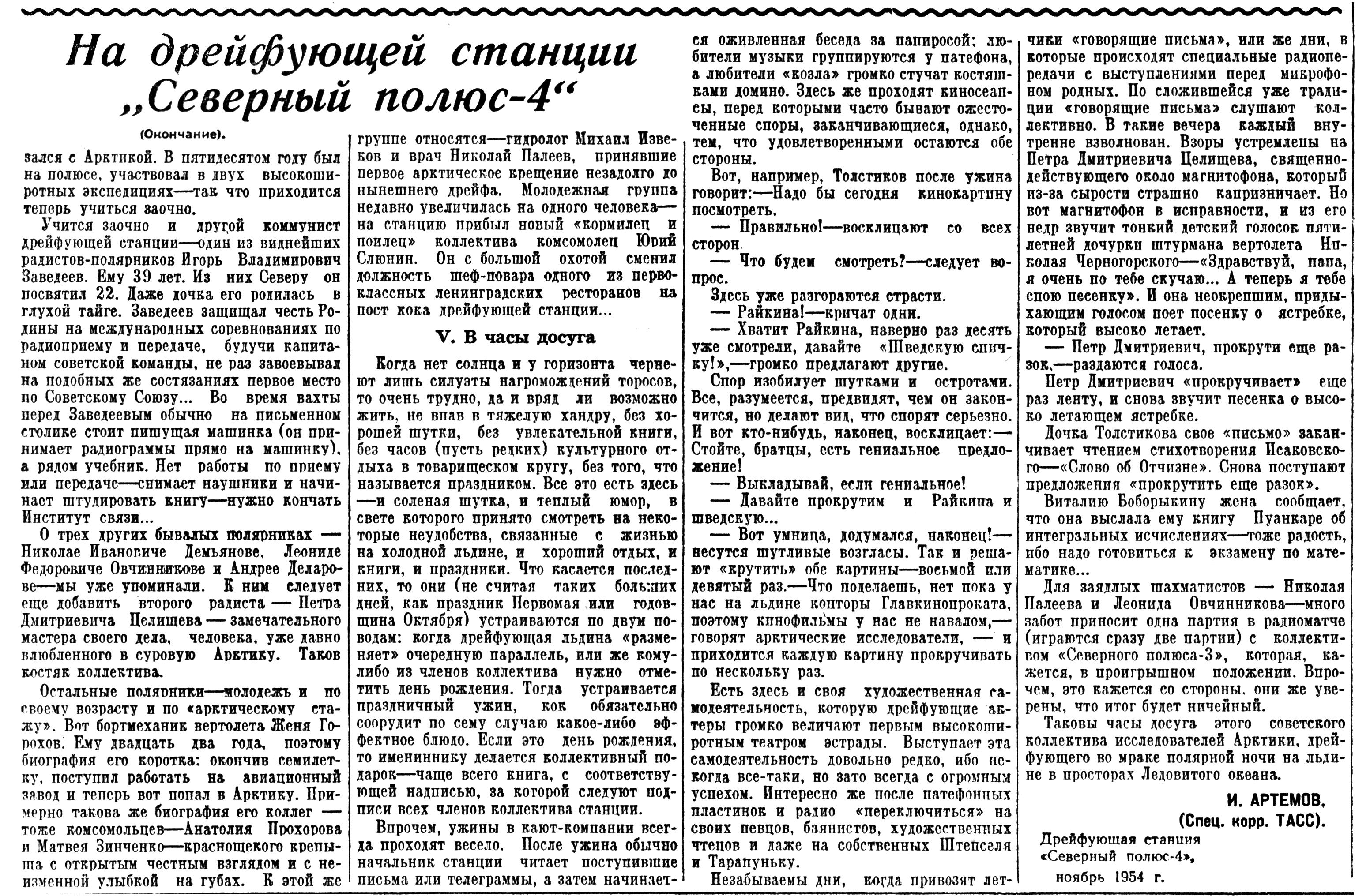 Есть здесь и своя художественная самодеятельность, которую дрейфующие актеры громко величают первым высокоширотным театром эстрады. Выступает эта самодеятельность довольно редко, ибо некогда все-таки, но зато всегда с огромным успехом. Интересно же после патефонных пластинок и радио «переключиться» на своих певцов, баянистов, художественных чтецов и даже на собственных Штепселя и Тарапуньку.