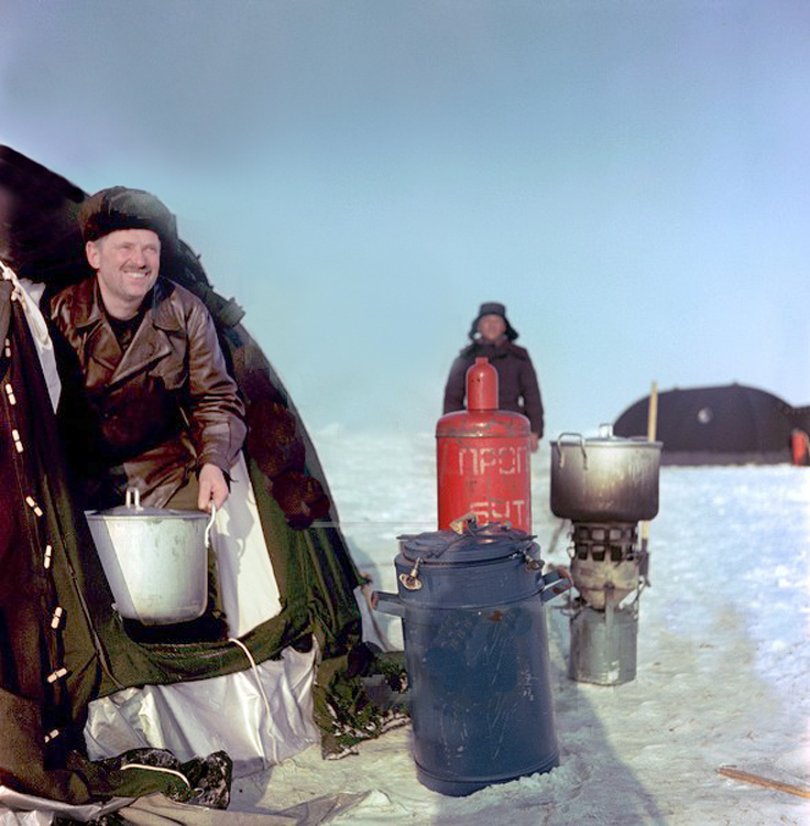 Вскоре гости и зимовщики собрались перед трибуной, сложенной из снежных блоков, под транспарантом «Да здравствует Первое мая!». Алексей Федорович зачитал приветственную радиограмму Председателя Президиума Верховного Совета К. Е. Ворошилова. Академик Д. И. Щербаков поздравил нас от имени президиума Академии наук СССР. С теплыми словами обратился к нам академик Е. К. Федоров — представитель легендарной папанинской четверки, открывшей счет советских дрейфующих станций. В общем все было как на Большой земле: речи, поздравления, аплодисменты и крики «ура».