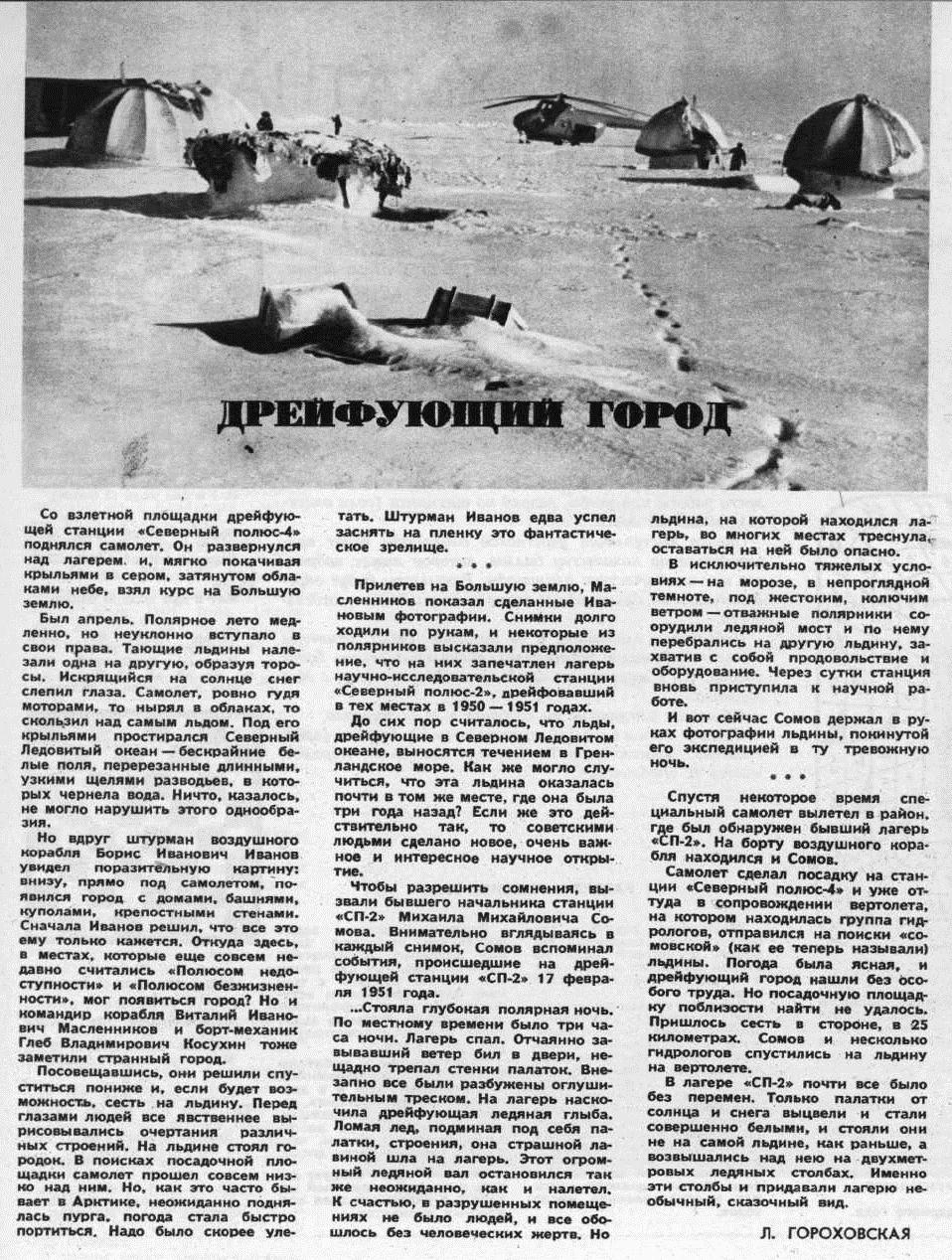 Но вдруг штурман воздушного корабля Борис Иванович Иванов увидел поразительную картину: внизу, прямо под самолетом, появился город с домами, башнями, куполами, крепостными стенами. Сначала Иванов решил, что все это ему только кажется. Откуда здесь, в местах, которые еще совсем недавно считались «Полюсом недоступности» и «Полюсом безжизненности», мог появиться город? Но и командир корабля Виталий Иванович Масленников и борт - механик Глеб Владимирович Косухин тоже заметили странный город.