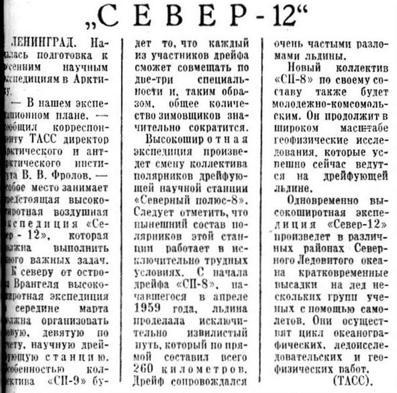 — Экспедиции «Север-12» предстоит сменить персонал «СП-8» и организовать еще одну дрейфующую станцию «Северный полюс-9». Как и в прошлом году, операциями будет руководить кандидат географических наук М. Никитин.