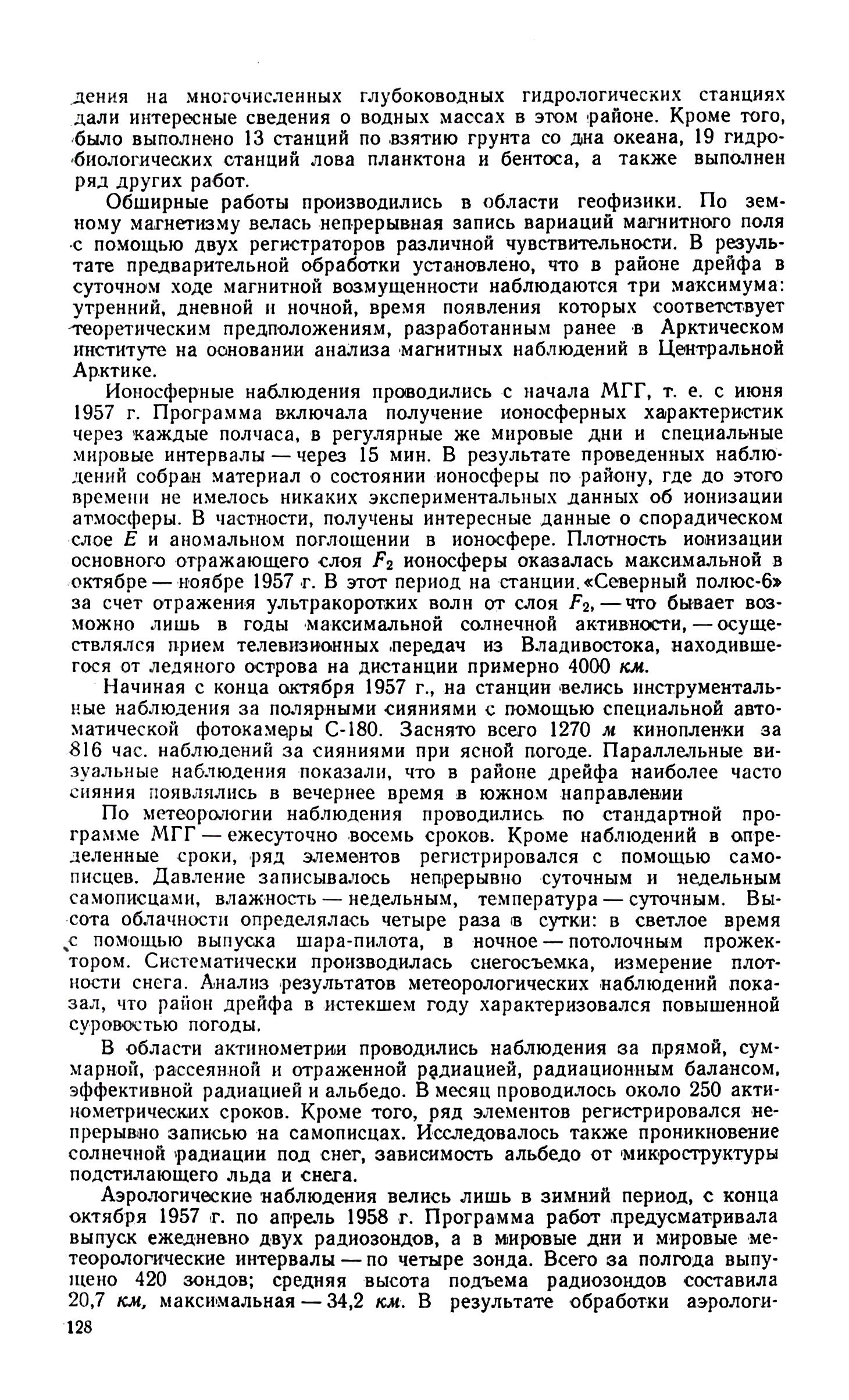 Ионосферные наблюдения проводились с начала МГГ, т. е. с июня 1957 г. Программа включала получение ионосферных характеристик через каждые полчаса, в регулярные же мировые дни и специальные мировые интервалы — через 15 мин. В результате проведенных наблюдений собран материал о состоянии ионосферы по району, где до этого времени не имелось никаких экспериментальных данных об ионизации атмосферы. В частности, получены интересные данные о спорадическом слое Е и аномальном поглощении в ионосфере. Плотность ионизации основного отражающего слоя F2 ионосферы оказалась максимальной в октябре — ноябре 1957 г. В этот период на станции «Северный полюс-6» за счет отражения ультракоротких волн от слоя F2 — что бывает возможно лишь в годы максимальной солнечной активности, — осуществлялся прием телевизионных передач из Владивостока, находившегося от ледяного острова на дистанции примерно 4000 км.