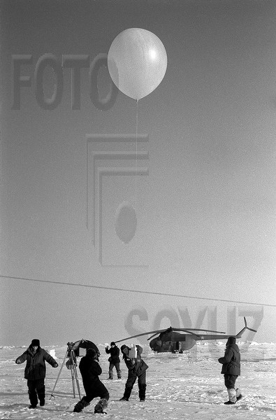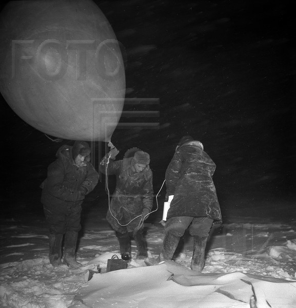 Научно-исследовательская дрейфующая полярная станция "Северный полюс-3" (СП-3). Аэрологи готовят радиозонд. Баллон из особой ткани-газгольдер наполнен водородом. Из него по резиновому шлангу газ перекачивают в оболочку зонда. Апрель 1954