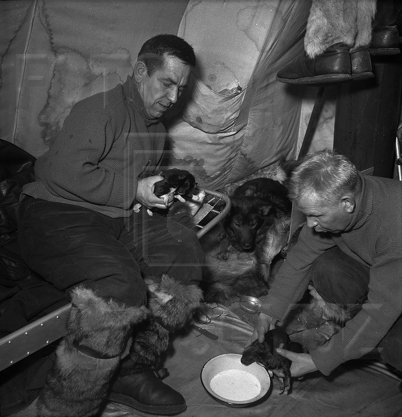 Научно-исследовательская дрейфующая полярная станция "Северный полюс-3" (СП-3). "Собака Дружба родила шестерых щенят. Все щенята здоровы" (одна из последних записей в вахтенном журнале). Опеку над щенками поручили гидрологу Александру Дмитриеву и метеорологу Анатолию Малкову.. Апрель 1954