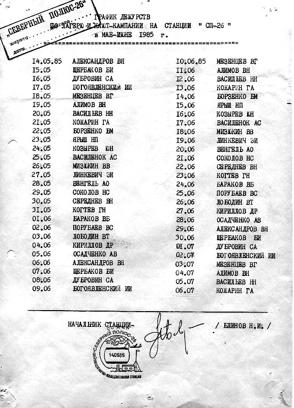 окончена смена: 10 мая 1985 г. 82°16' с.ш.; 166°13' з.д.