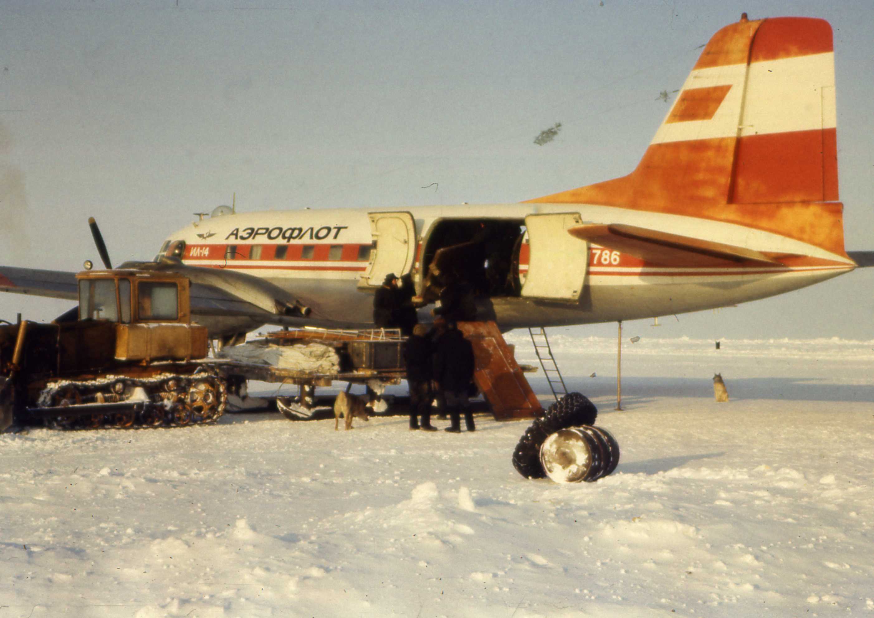 Диспетчер РП Гоша Чиин (аэропорт Якутск) заруливает ИЛ-14 в "карман" ледовой ВПП.