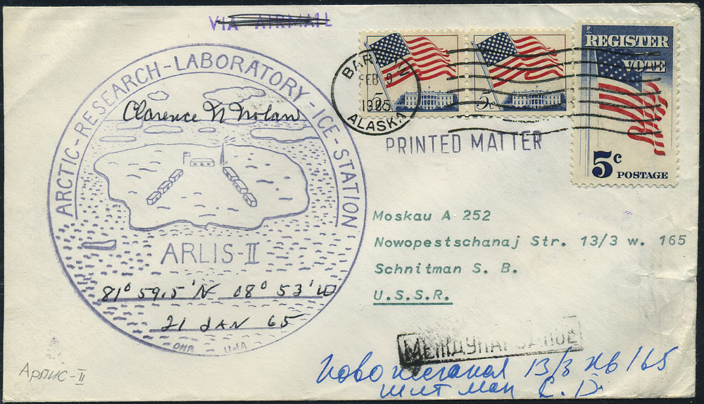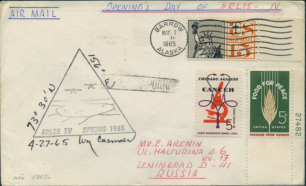 Станция «Арлис-5» начала работу 19 мар­та 1970 г. в точке с координатами 72°54' сев. шир. и 162° зап. долг. Эвакуирована она в конце мая: последняя корреспонденция, отправленная со станции, погашена календар­ным штемпелем в Барроу 2 июня. Исследования на станции «Арлис-6» начались 27 мар­та 1970 г. Координаты — 73°44' сев. шир. и 157°45' зап. долг. Через 64 дня станция пре­кратила существование. В последний день — 29 мая 1970 г. — ее координаты были следу­ющие: 75° сев. шир. и 170° зап. долг. Послед­няя почта, обрабатывавшаяся также в Бар­роу, имела дату 1 июня 1970 г.