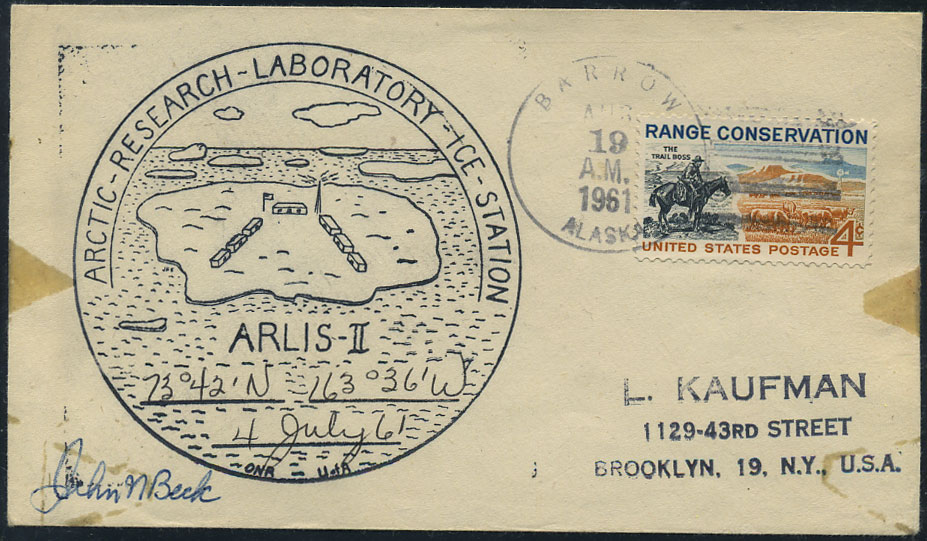 В день высадки производилось гашение почты календарным почтовым штемпелем ледокола. На самой же дрейфующей станции, как и прежде, почтового оффиса не было. Использовались два больших сопроводительных штемпеля. Иногда ставили одновременно оба штемпеля, и тогда один из них пришлось помещать на обороте конверта. Прямоугольный штемпель включал указание даты и времени, а также предусматривал место для широты и долготы. Столбиком помещены слова, образующие сокращение «Арлис». На рисунке — плывущий в море ледовый остров с сооружениями станции. Второй штемпель, не имеющий рамки, также изображает станцию на льдине. Из вписанных от руки обозначений явствует, что в день высадки 11 сентября 1960 г. у станции «Арлис-1» были следующие координаты: 75° 12' сев. шир. и 136°22' зап. долг.