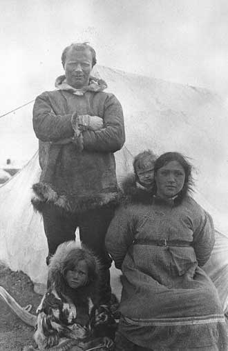 Storker Storkerson, his wife Elvina, and their daughters Martina and Aida at the Polar Bear camp, Armstrong Point, northwest Victoria Island, N.W.T. June 1, 1916. GHW 51180. Source: Canadian Museum of Civilization
