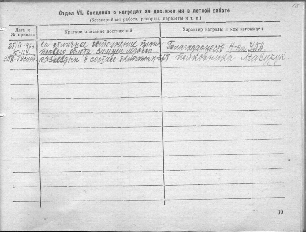 25/IV-46г. За отличное выполнение плана первого облёта зимней ледовой разведки в составе экипажа Н-368. Благодарность н-ка УПА полковника Мазурук.