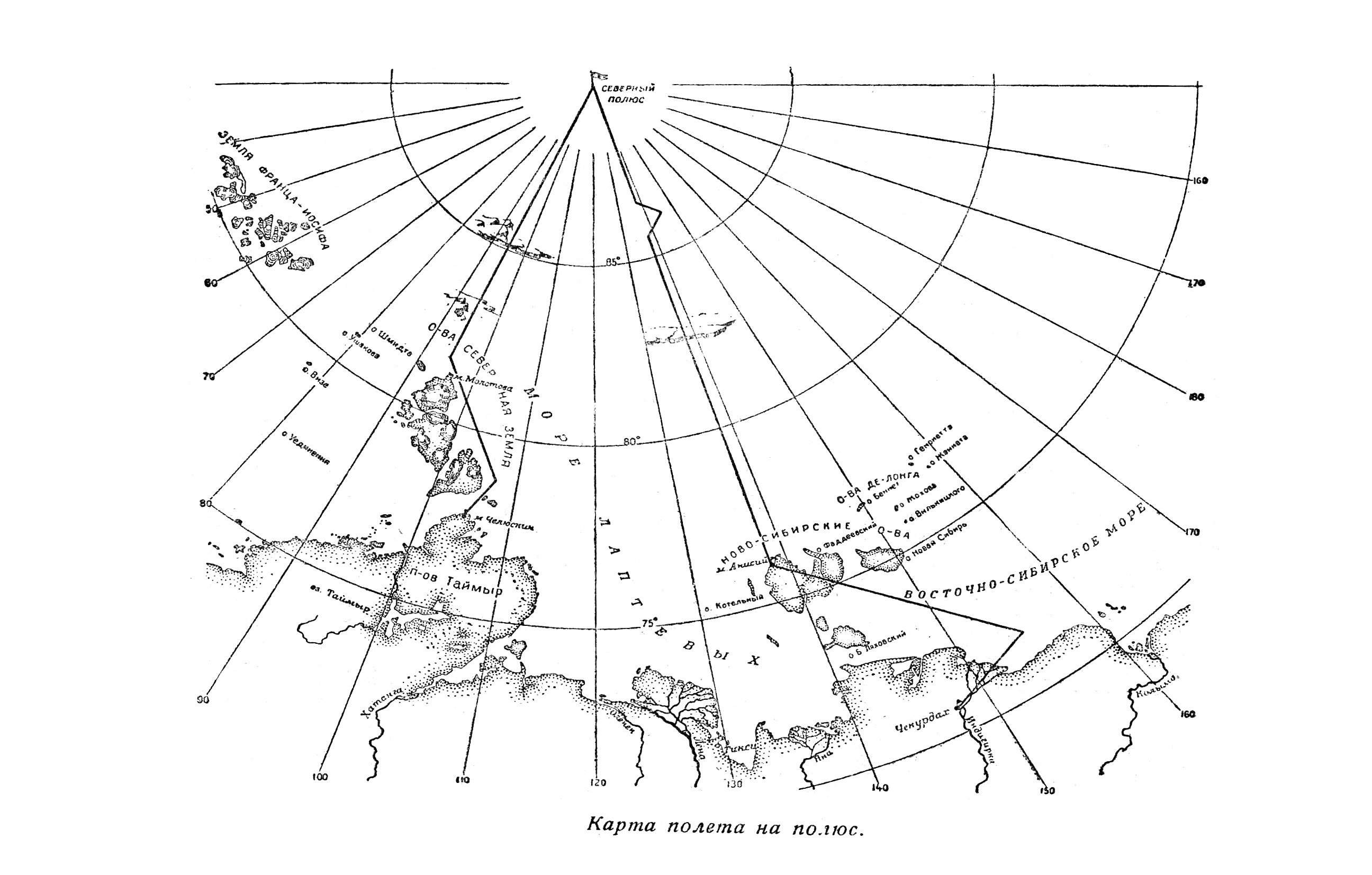 -На Челюскине сидим неделю: выбираем погоду. Полет от Челюскина до полюса и обратно на Котельный- 14 часов (кажется, я не напутал- ЛБ). Взлет с большой перегрузкой- вся машина в баках. Всё- месяц.
