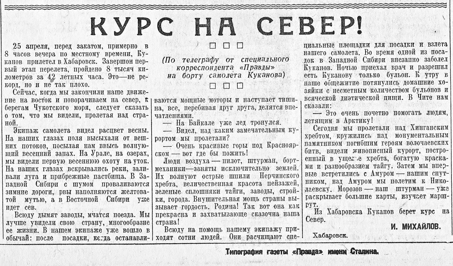 «Правда». 27 апреля 1935 г. № 116 (6362).КУРС НА СЕВЕР! (По телеграфу от специального корреспондента «Правды» на борту самолёта Куканова)25 апреля, перед закатом, примерно в 8 часов вечера по местному времени, Куканов прилетел в Хабаровск. Завершон первый этап перелёта, пройдено 8 тысяч километров за 42 лётных часа. Это — не рекорд, но и не так плохо.