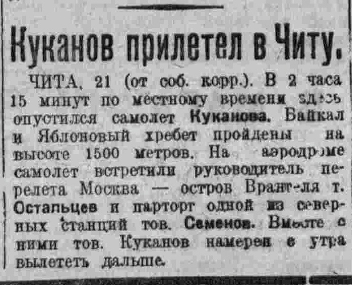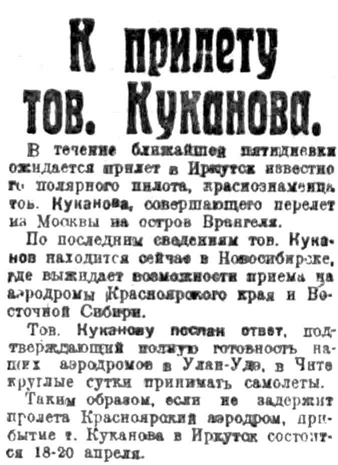 «Правда». 20 апреля 1935 г. № 109 (6355).КУКАНОВ ПРИЛЕТЕЛ В ИРКУТСКИРКУТСК, 19 апреля. (Спец. корр. «Правды»). Пробиваясь сквозь туман, самолёт Куканова на рассвете поднялся над Красноярском. Путь от Красноярска до Иркутска — 1.000 километров — мы прошли в 4½ часа. Утром вылетаем в Читу.