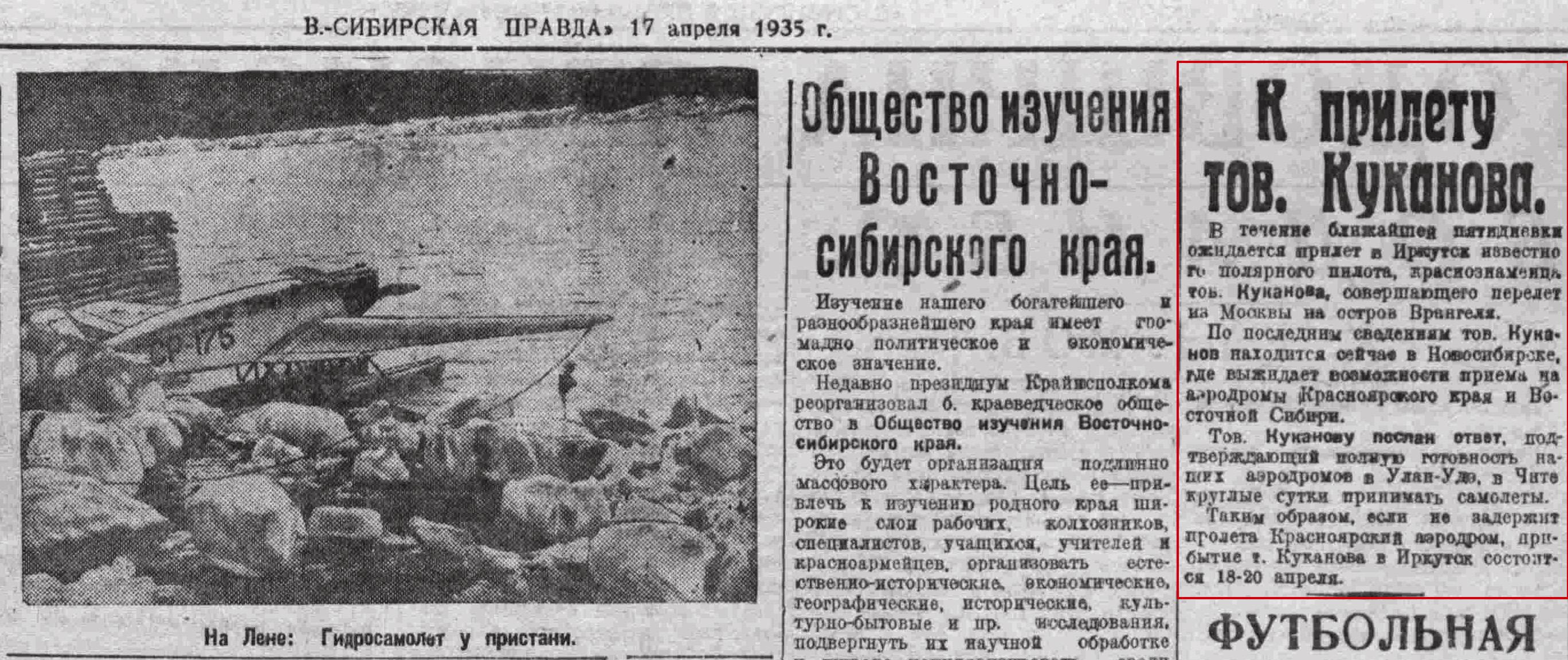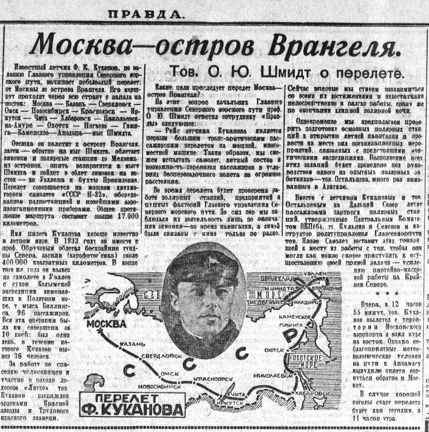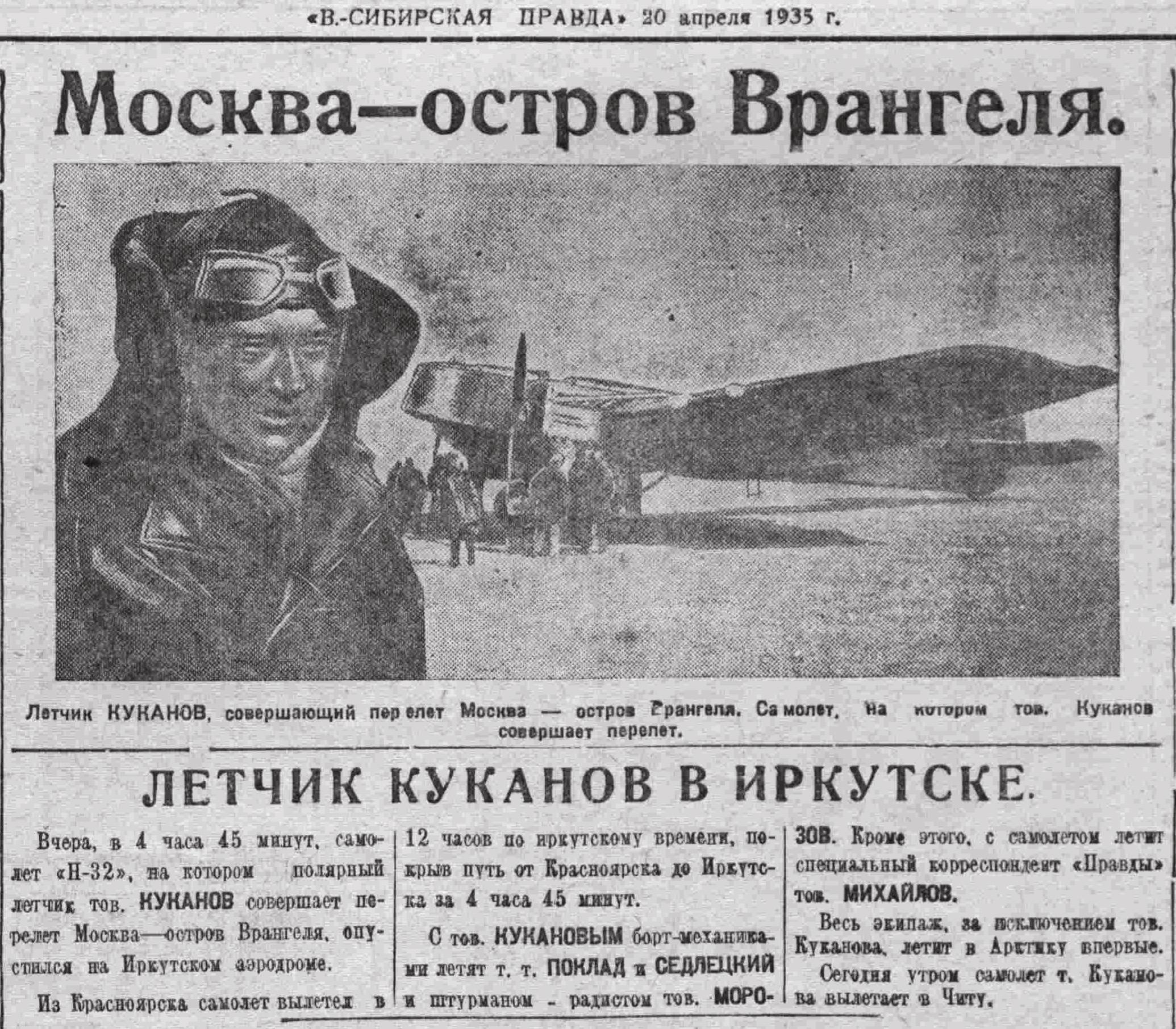 «Правда». 23 марта 1935 г. № 81 (6327).Москва — остров Врангеля.Известный лётчик Ф. К. Куканов, по заданию Главного управления Северного морского пути, начинает небывалый перелёт: от Москвы до острова Врангеля. Его маршрут проходит через всю страну с запада на восток: Москва — Казань — Свердловск — Омск — Новосибирск — Красноярск — Иркутск — Чита — Хабаровск — Николаевск-на-Амуре — Охотск — Ногаево — Гижига — Каменское — Анадырь — мыс Шмидта.