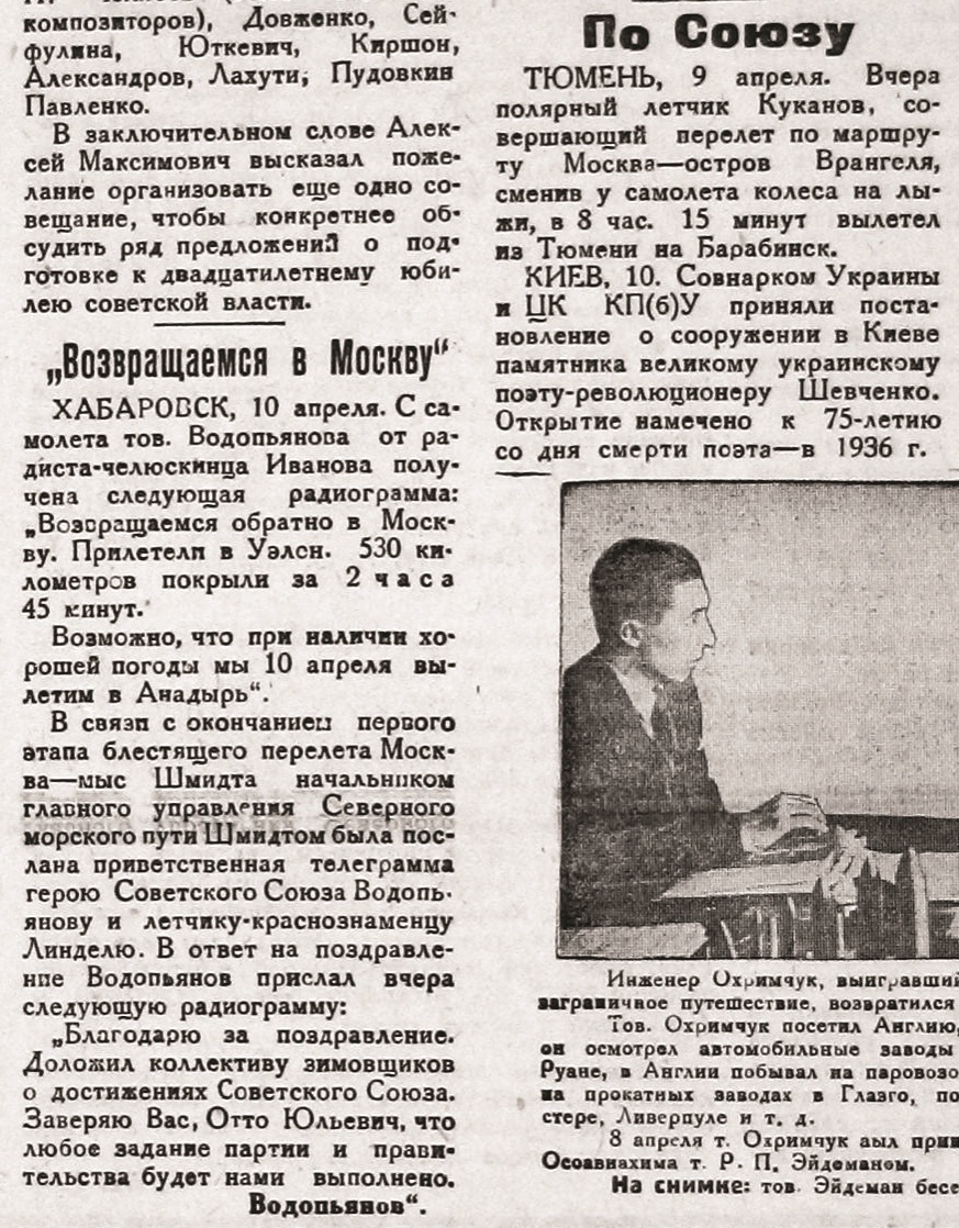 Тов. О. Ю. Шмидт о перелёте.Какие цели преследует перелёт Москва — остров Врангеля?
