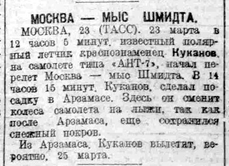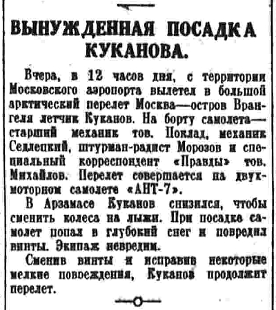 «Правда». 24 марта 1935 г. № 82 (6328).ВЫНУЖДЕННАЯ ПОСАДКА КУКАНОВА.Вчера, в 12 часов дня, с территории Московского аэропорта вылетел в большой арктический перелёт Москва — остров Врангеля лётчик Куканов. На борту самолёта — старший механик тов. Поклад, механик Седлецкий, штурман-радист Морозов и специальный корреспондент «Правды» тов. Михайлов. Перелёт совершается на двухмоторном самолёте «АНТ-7».