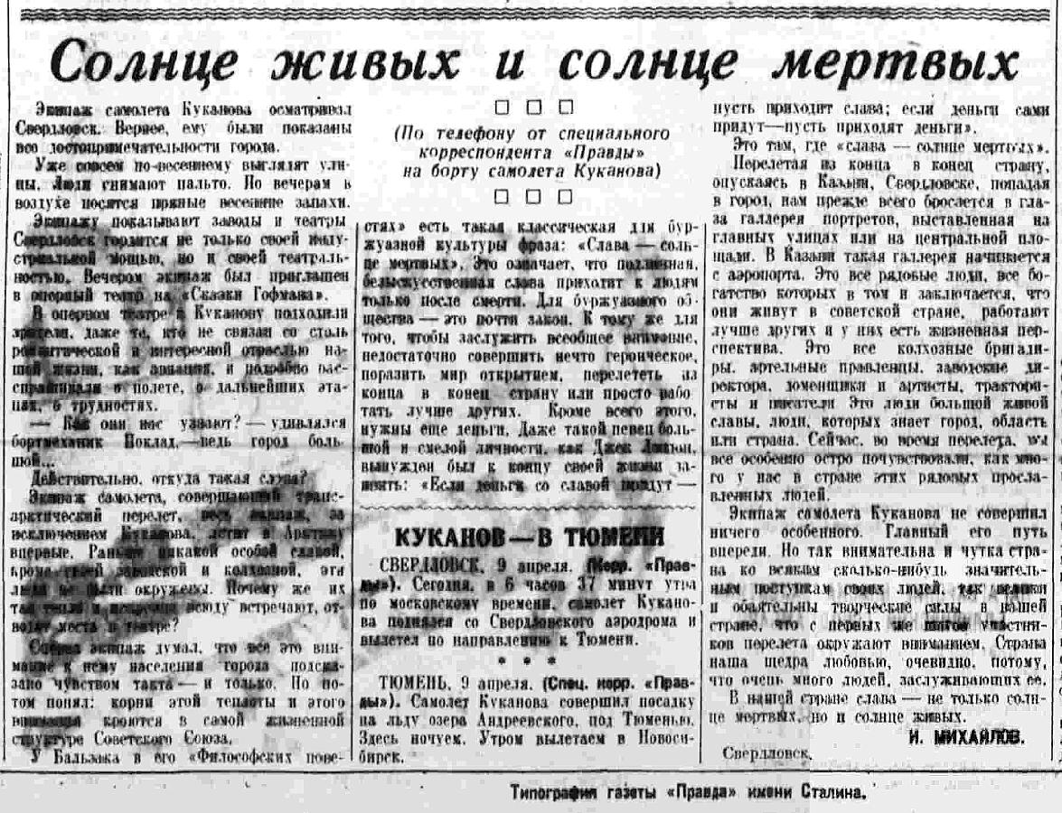 «Правда». 10 апреля 1935 г. № 99 (6345).Солнце живых и солнце мёртвых(По телефону от специального корреспондента «Правды» на борту самолёта Куканова).Экипаж самолёта Куканова осматривал Свердловск. Вернее, ему были показаны все достопримечательности города.