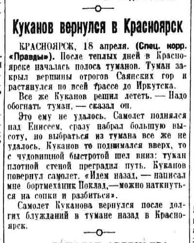 «Правда». 19 апреля 1935 г. № 108 (6354).Куканов вернулся в КрасноярскКРАСНОЯРСК, 18 апреля. (Спец. корр. «Правды»). После тёплых дней в Красноярске началась полоса туманов. Туман закрыл вершины отрогов Саянских гор и растянулся по всей трассе до Иркутска.