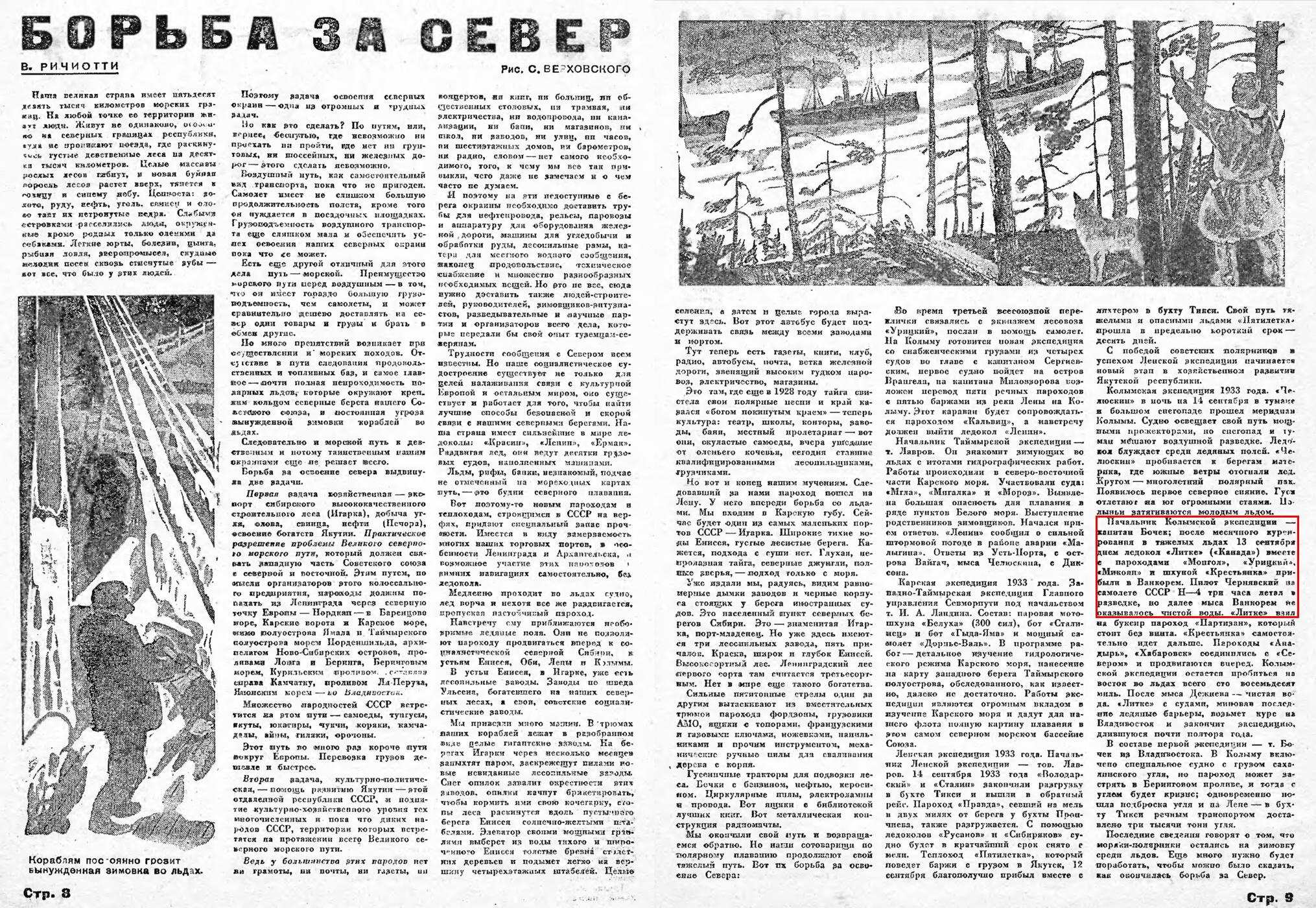 "Начальник Колымской экспедиции - капитан Бочек; после месячного курсирования в тяжелых льдах 13 сентября днём ледокол "Литке" ("Канада") вместе с пароходами "Монгол", "Урицкий", "Микоян" и шхуной "Крестьянка" прибыли в Ванкарем. Пилот Чернявский на самолете СССР Н-4 три часа летал в разведке, но далее мыса Ванкарем не оказывалось чистой воды. ... "