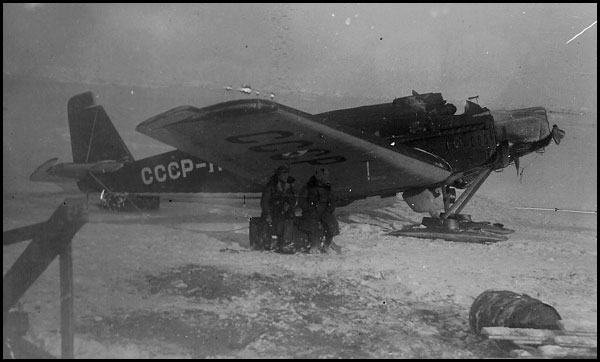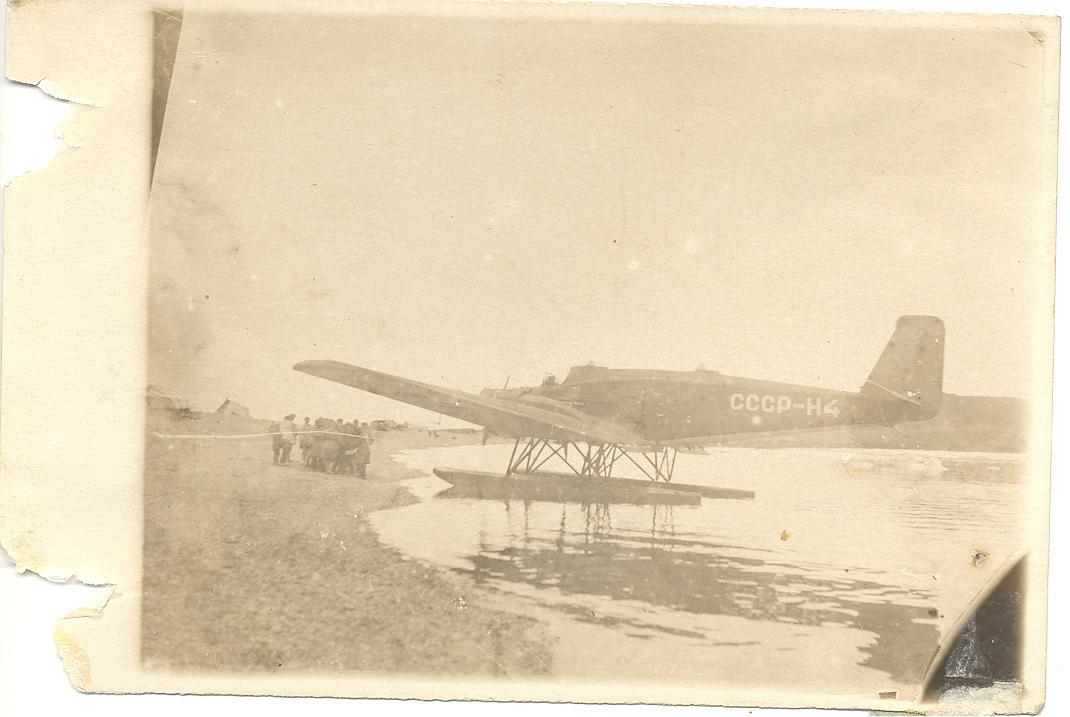 Самолёт был почти над нами. Это был большой, как нам удалось рассмотреть, трёхмоторный поплавковый самолёт. На фюзеляже мы прочли «СССР-Н-4». Через некоторое время самолёт, покружив над факторией, взбаламутил воду и подошёл к берегу. Из самолёта начали выходить люди. Мы увидели Г. Д. Красинского, бывшего у нас в 1932 году. Остальные были незнакомы. С ним пришли: лётчик Куканов, второй пилот Чернявский, бортмеханики Шадрин и Демидов и радист Траутман.
