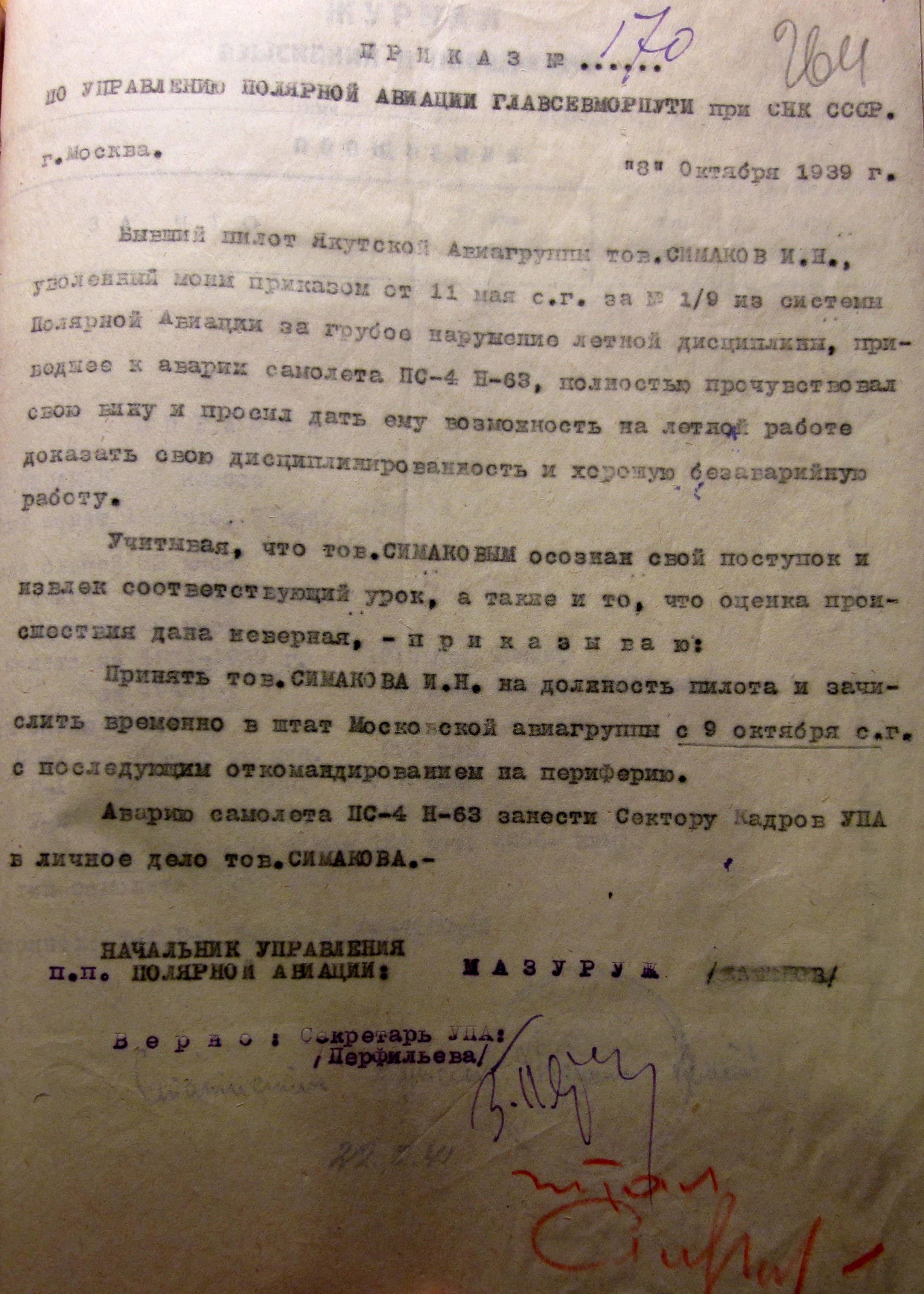 С Симаковым поступили суровее, чем с Масленниковым за аварию СССР-Н62. Правда, за ним уже были "грешки" по части летной дисциплины. Приказом начальника УПА Мазурука от 11 мая 1939 года Симакова сняли с летной работы и уволили из полярной авиации. Впрочем, уже 8 октября того же года Симаков был восстановлен в должности пилота УПА и зачислен временно в штат Московской авиагруппы "с последующим откомандированием на периферию". Основанием для этого послужило то, что "Симаковым осознан свой поступок и извлечен соответствующий урок, а также и то, что оценка происшествия дана неверная". [РГАЭ, 9570-2-2969]