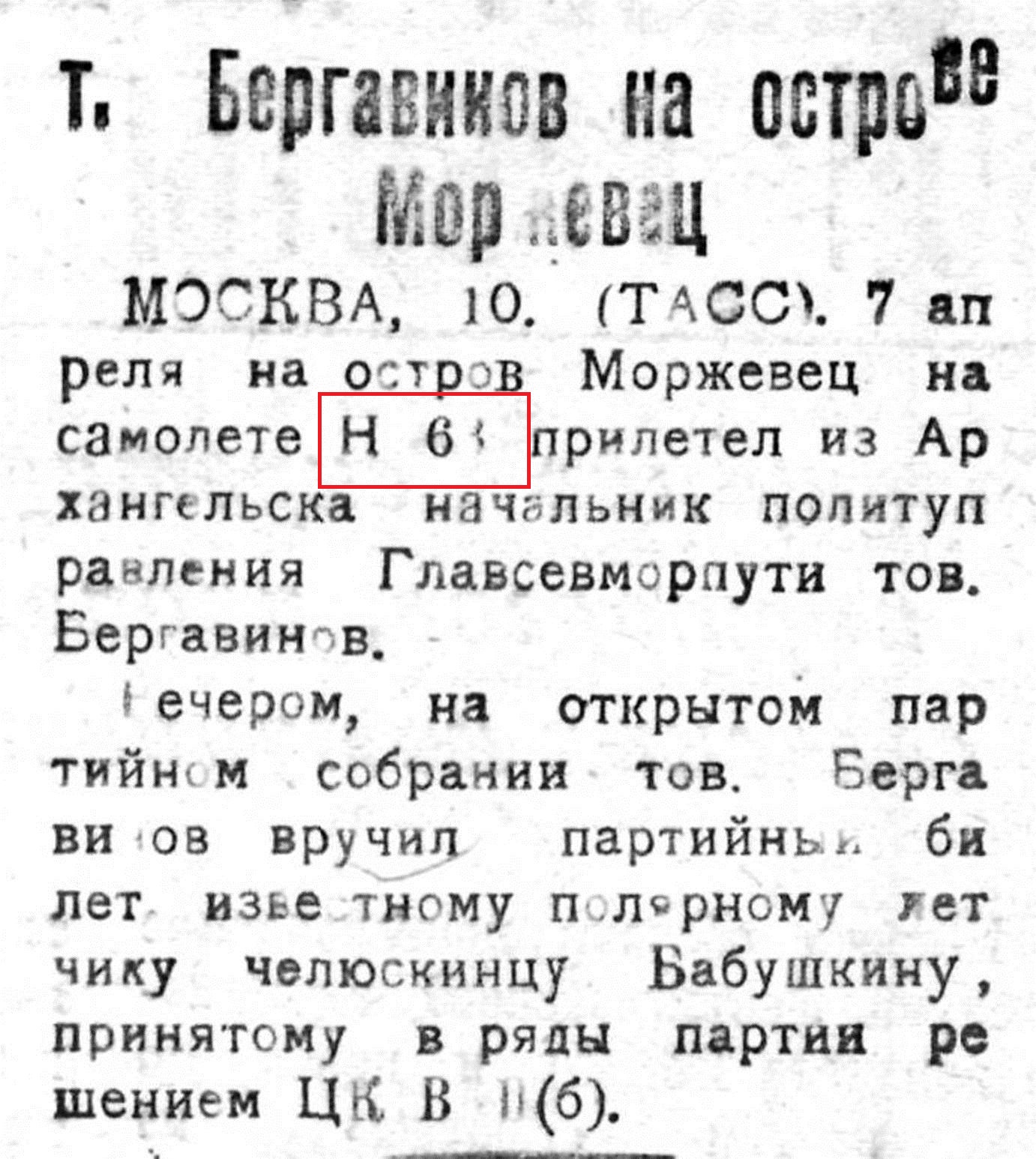 МОСКВА, 10. (ТАСС). 7 апреля на остров Моржевец на самолете Н-63 прилетел из Архангельска начальник политуправления Главсевморпути тов. Бергавинов.