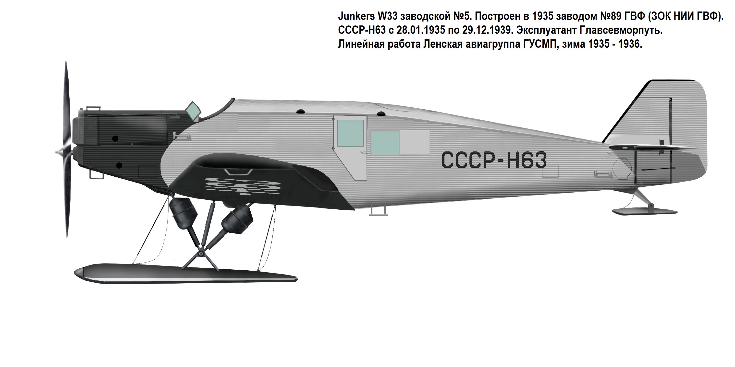 28 января 1935 дата присвоения опознавательного знака с литерой "Н" - СССР-Н63 - ПС-4 (Junkers W-33), зав. № 5, мотор - Junkers L-5. ПС-4 СССР-Н63 поступил на линии Ленской авиагруппы 13.01.36 г. В 1937 г. летал только зимой, налетал 364 часа 41 мин. и 58655 км. В летнее время был законсервирован по причине отсутствия поплавков.[РГАЭ, 9570-2-1156]