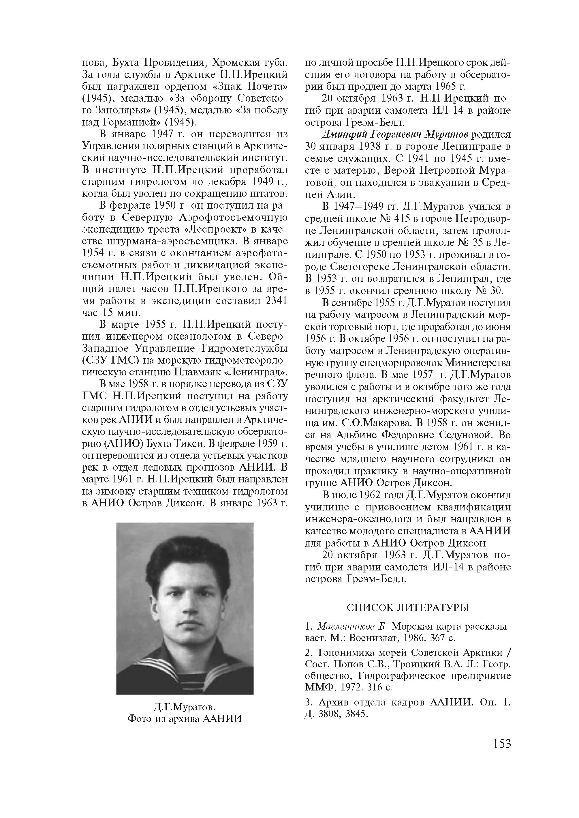 Санкт-Петербург, aaricoop@aari.nw.ru 20 октября 1963 г. во время полета в условиях полярной ночи над узкими проливами архипелага Земля Франца-Иосифа в районе острова Греэм-Белл экипаж самолета ИЛ-14 (командир Н. В. Мироненко) потерял пространственную ориентировку. Самолет столкнулся с пологим склоном ледника, который не отразился на бортовом локаторе. В результате катастрофы погибли пять членов экипажа самолета и два сотрудника ААНИИ — гидрологи Николай Петрович Ирецкий и Дмитрий Николаевич Муратов. Решением Архангельского облисполкома от 14 января 1964 г. крайний западный мыс острова Греэм-Белл — мыс Песчаный был переименован в мыс Семерых в память экипажа самолета ИЛ-14 и гидрологов ААНИИ Николая Петровича Ирецкого и Дмитрия Георгиевича Муратова.Николай Петрович Ирецкий родился 29 апреля 1913 г. в селе Бежаницы Бежаницкого района Великолукской области в семье служащего. С 1920 по 1929 г. он учился в средней школе с педагогическим уклоном в городе Новоржеве (Псковская область). По окончании школы Н. П. Ирецкий работал учителем начальной школы, сначала в деревне Девонисово Славковского района (с ноября 1929 по февраль 1930 г.), затем в деревне Дубье Чихачевского района Псковской области (в 1930-1931 гг.).