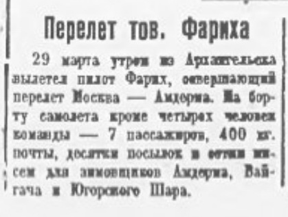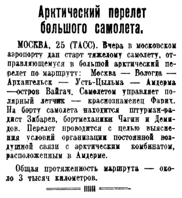 24 марта вылетел из Москвы краснознаменец-летчик Ф. Б. Фарих на тяжелом самолете в большой арктический полет. Его маршрут: Москва — Вологда — Архангельск — Усть-Цильма — Амдерма — о. Вайгач, всего около 3000 км.